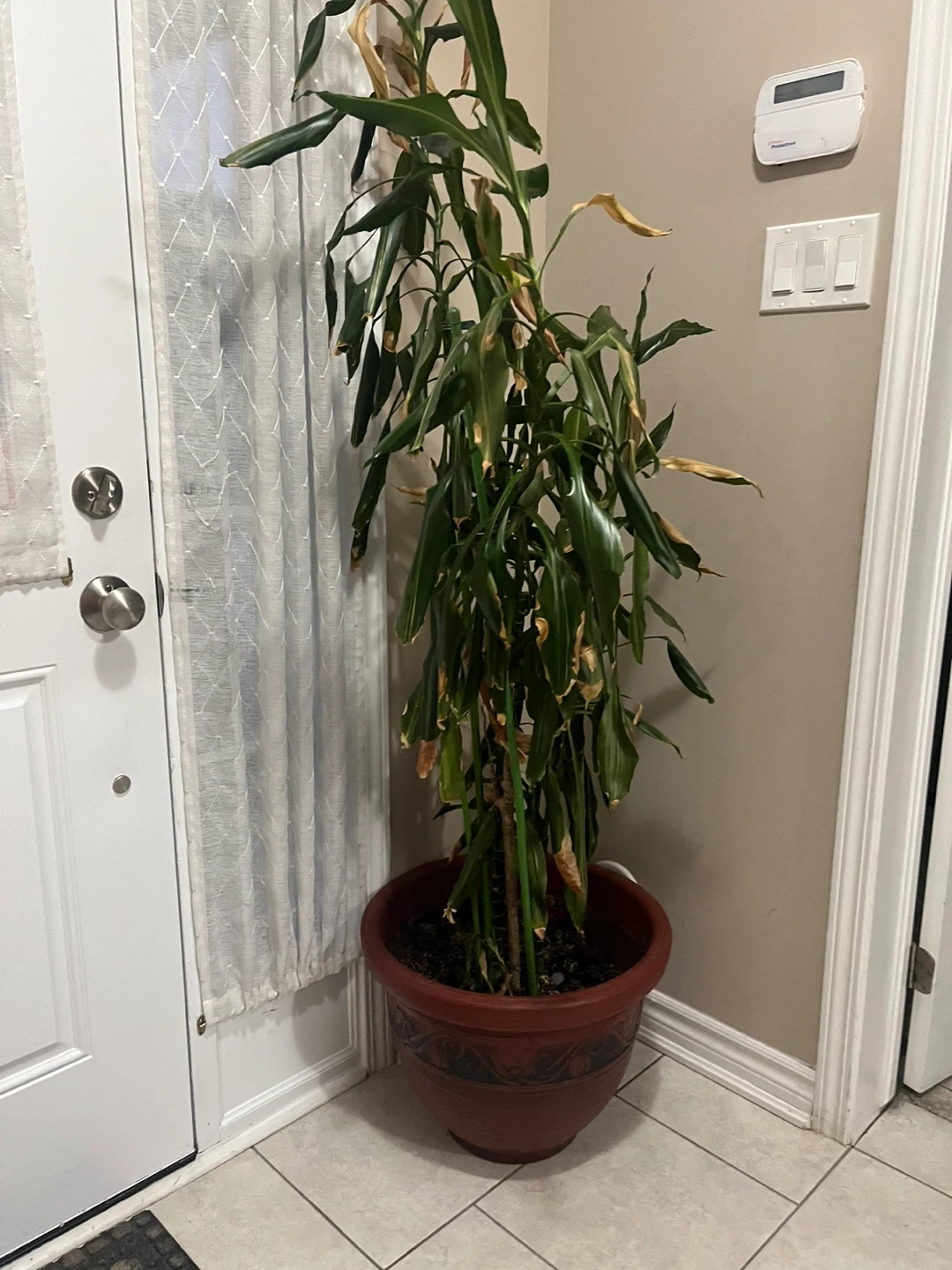 Dracaena Massangeana, commonly known as the Corn Plant. It's in a decorative terracotta-style pot. Some leaves show browning, suggesting it needs some TLC! This plant's tall structure makes it a statement piece for any room.
