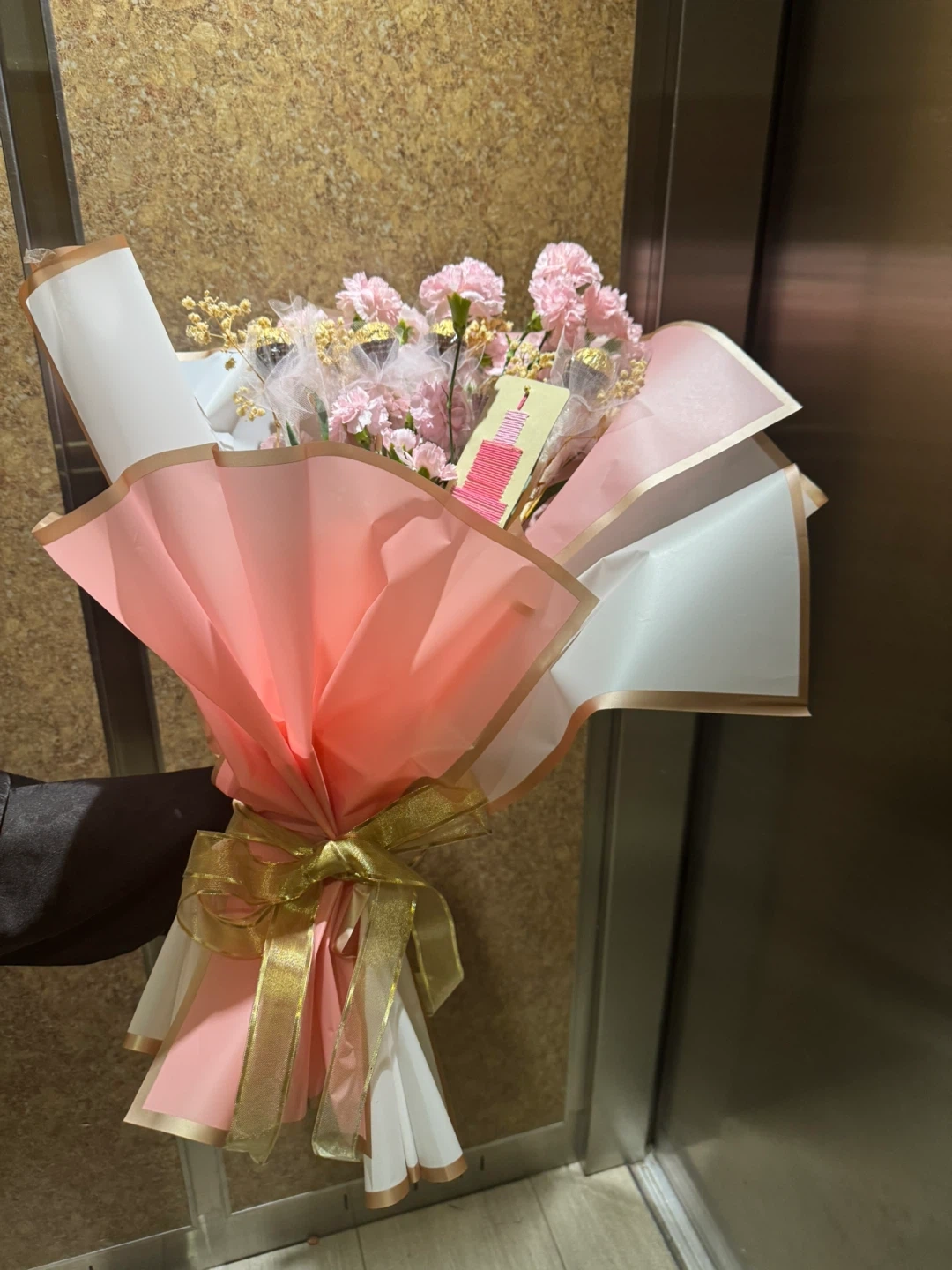 A lovely bouquet featuring pink carnations and Ferrero Rocher chocolates, all wrapped with decorative pink and white paper and a gold ribbon. It includes a small decorative tag. This would make a sweet gift for someone special!