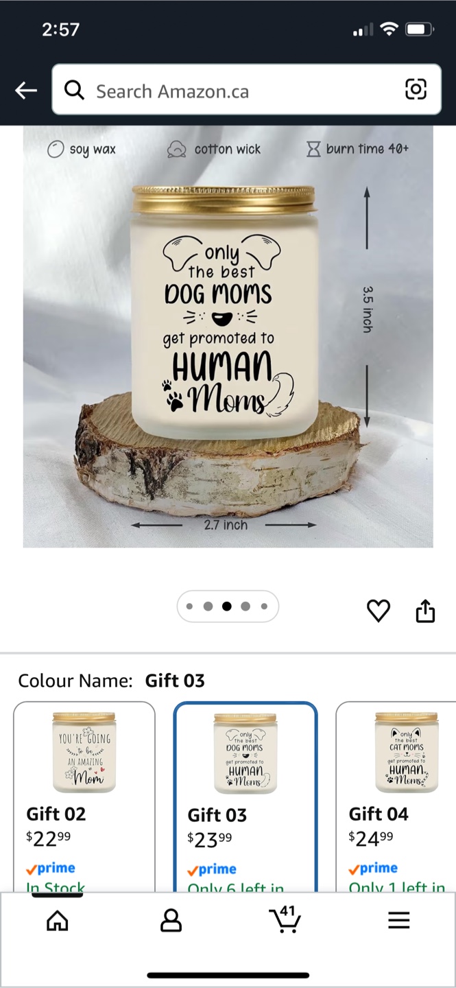 Soy wax candle with cotton wick. This candle has a burn time of 40+ hours. It measures 3.5 inches tall and 2.7 inches wide. Makes a great gift for any dog mom!