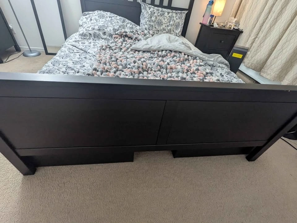 Bed has 3 storage drawers. Queen Bed with slats. Pick up only. If you want the mattress and bed sheets and duvet and pillows Etc. I can give you a deal for $750 total.