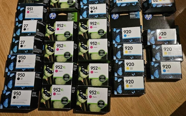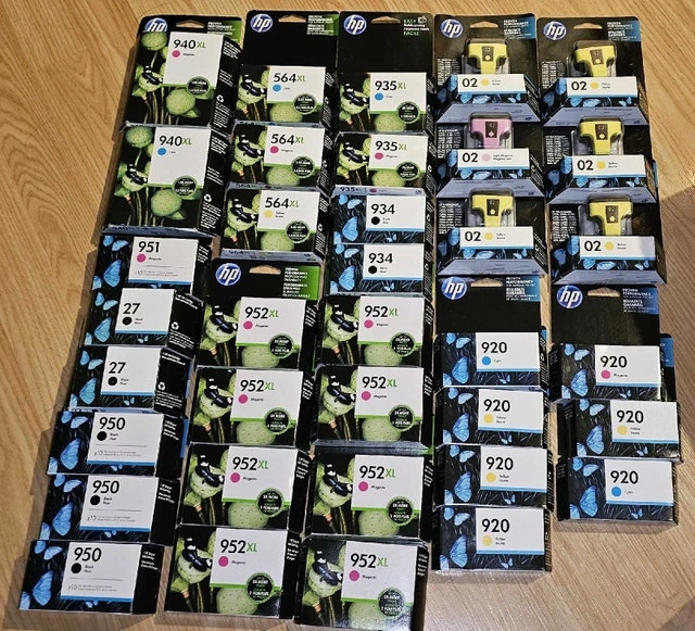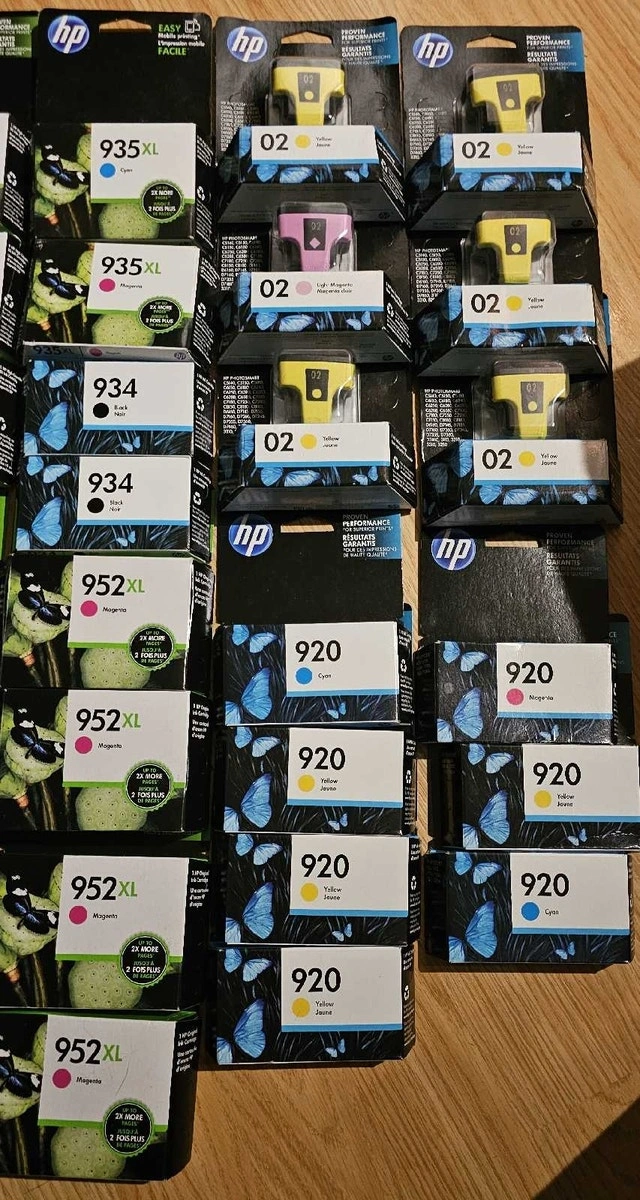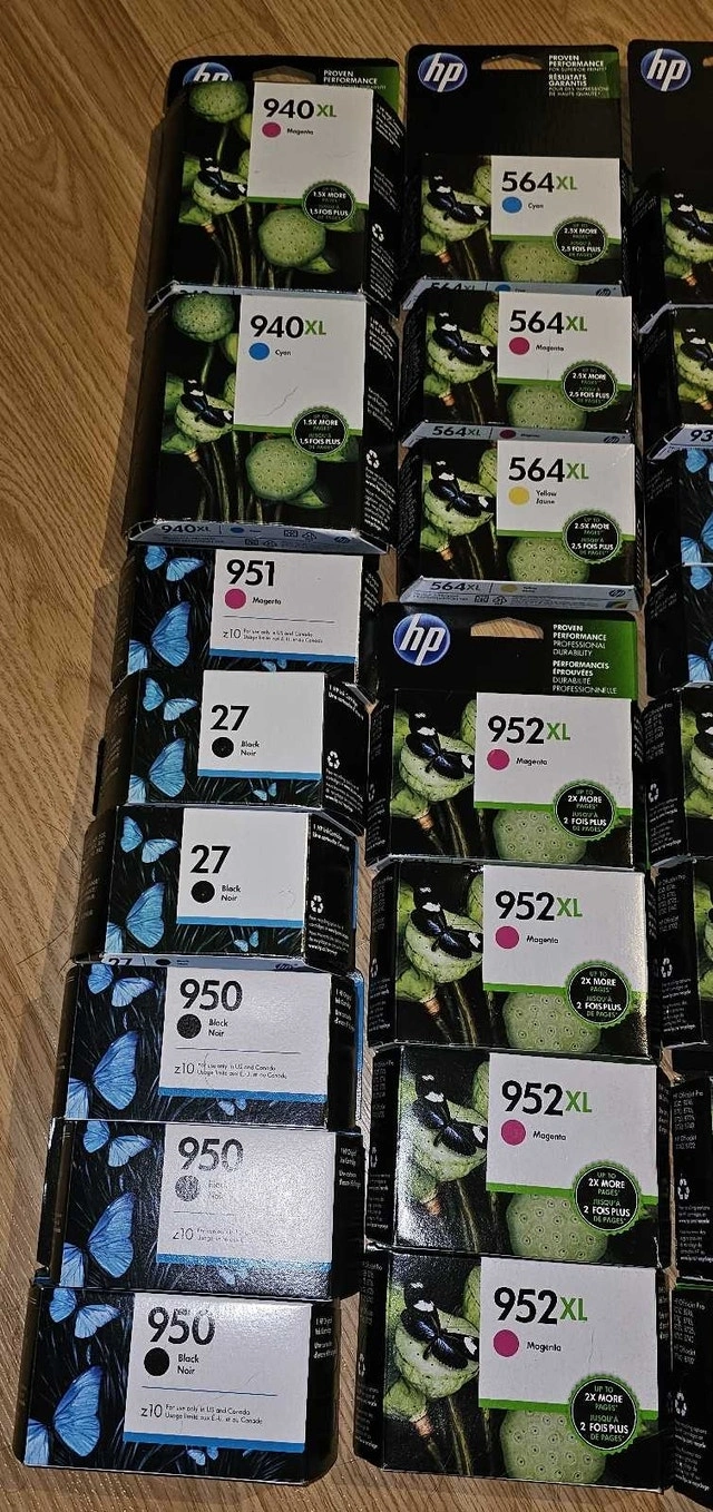Selling genuine HP ink cartridges. All are new, sealed in original boxes, and are old stock (expired but tested with perfect results). Take all 35 remaining cartridges for $100, or buy individually: