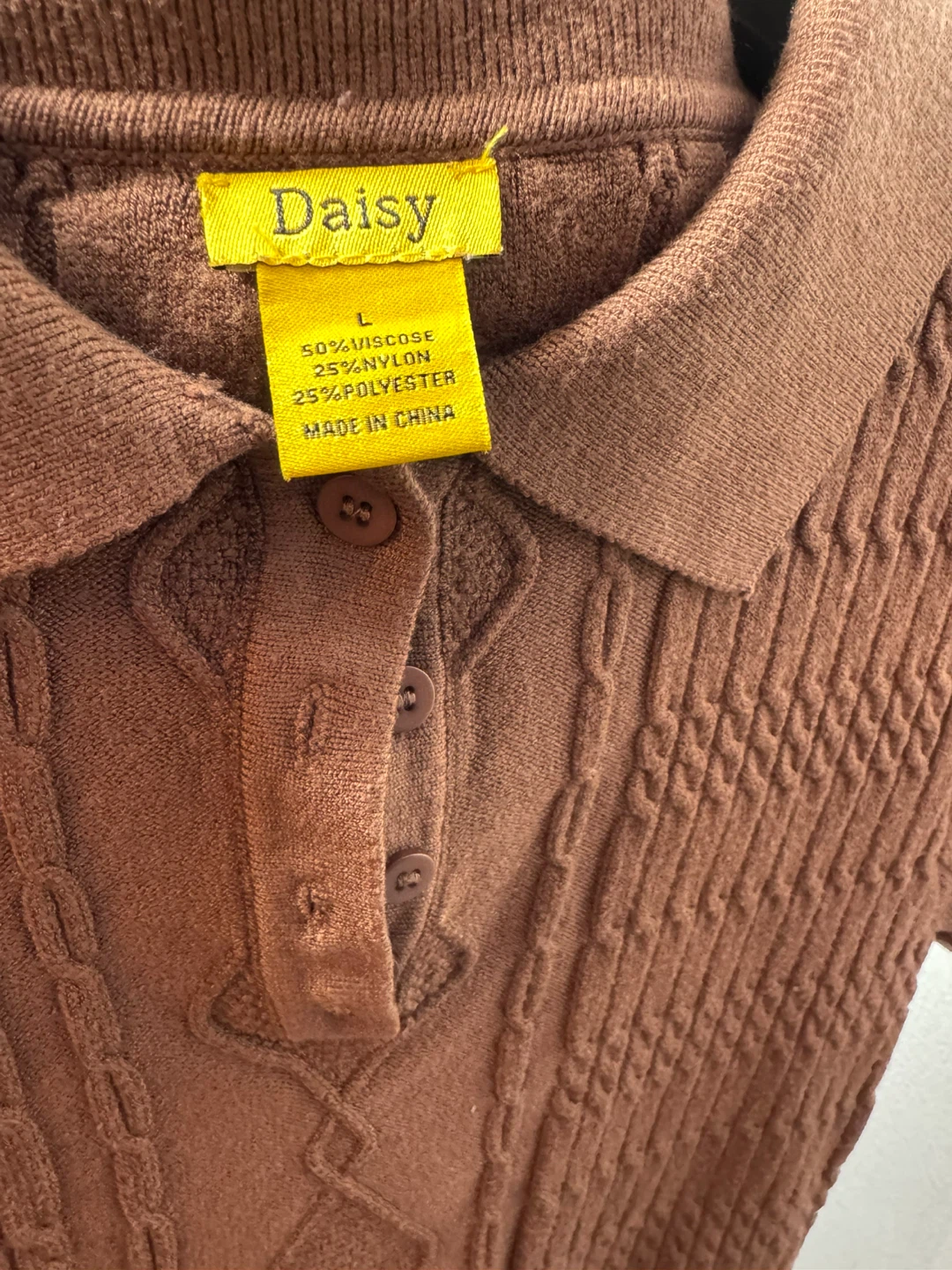 Daisy knit shirt with a collared neckline and short sleeves. Made from 50% viscose, 25% nylon, and 25% polyester. Size L.