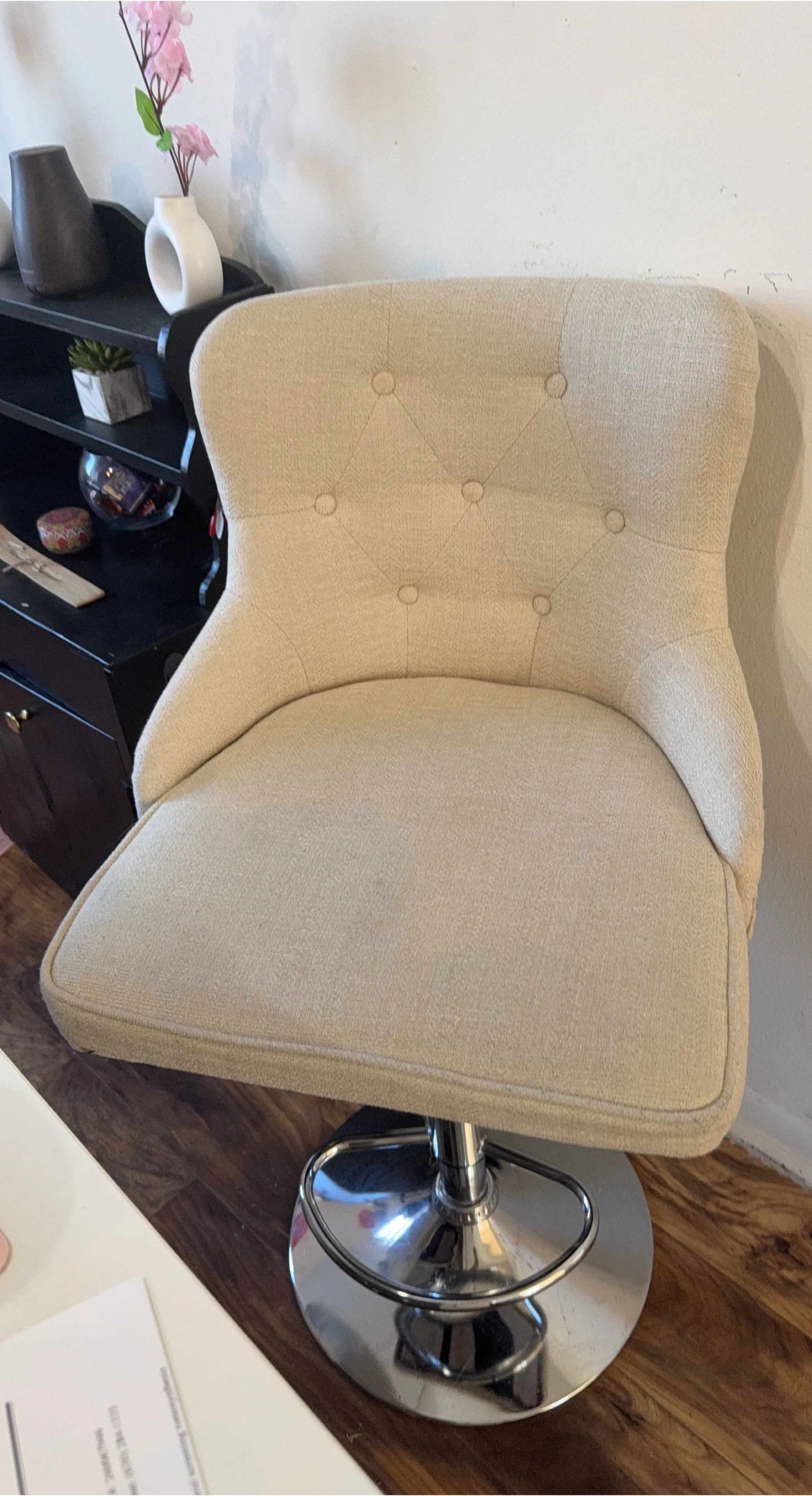 This adjustable bar stool features a tufted backrest and a cushioned seat. The base is made of polished chrome, and it's upholstered in a textured beige fabric. Its height is adjustable for comfortable seating at different counter heights!