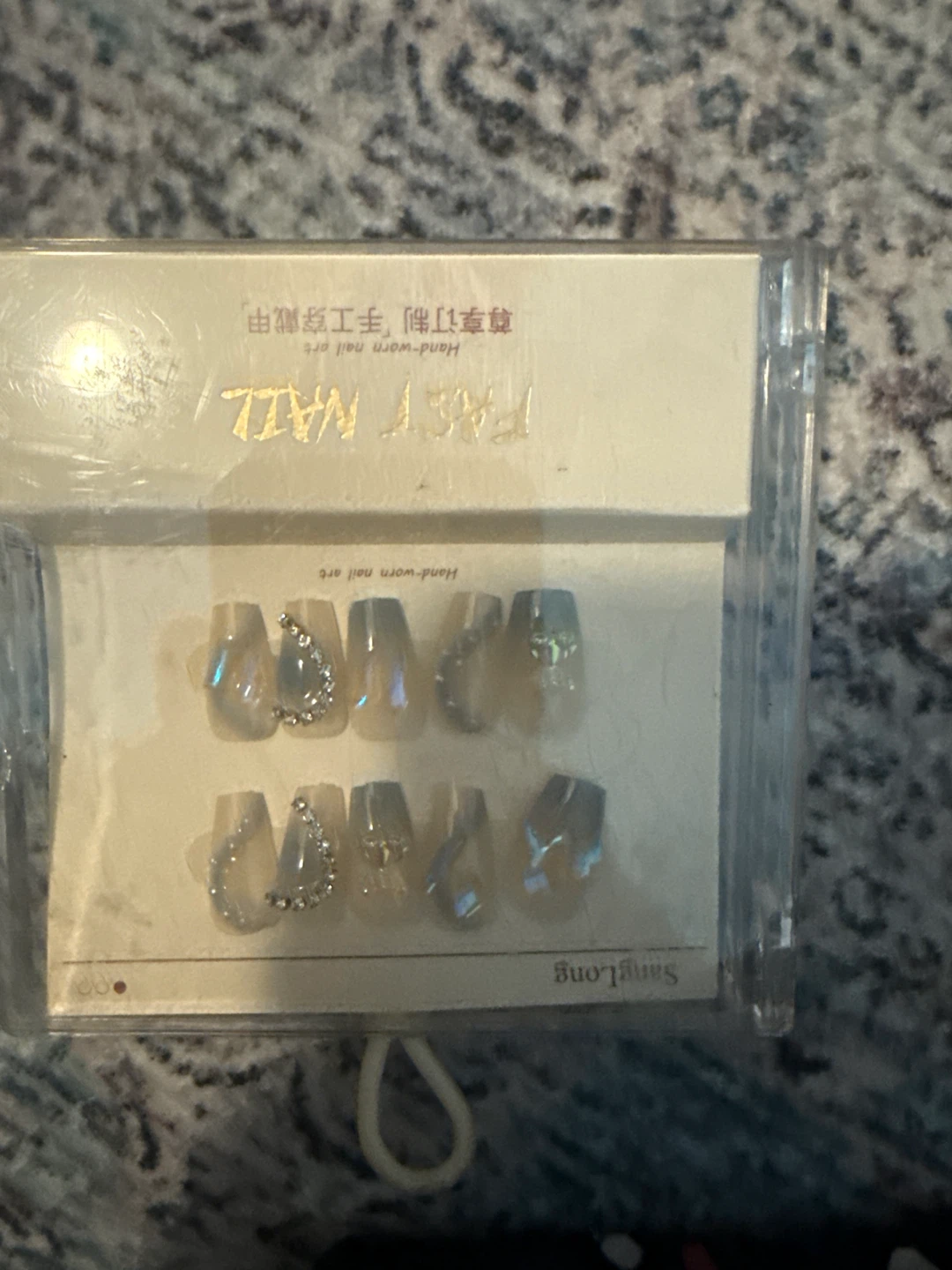 This is a set of FAST NAIL hand-worn nail art. The set includes decorated press-on nails. They are designed for a sophisticated look.