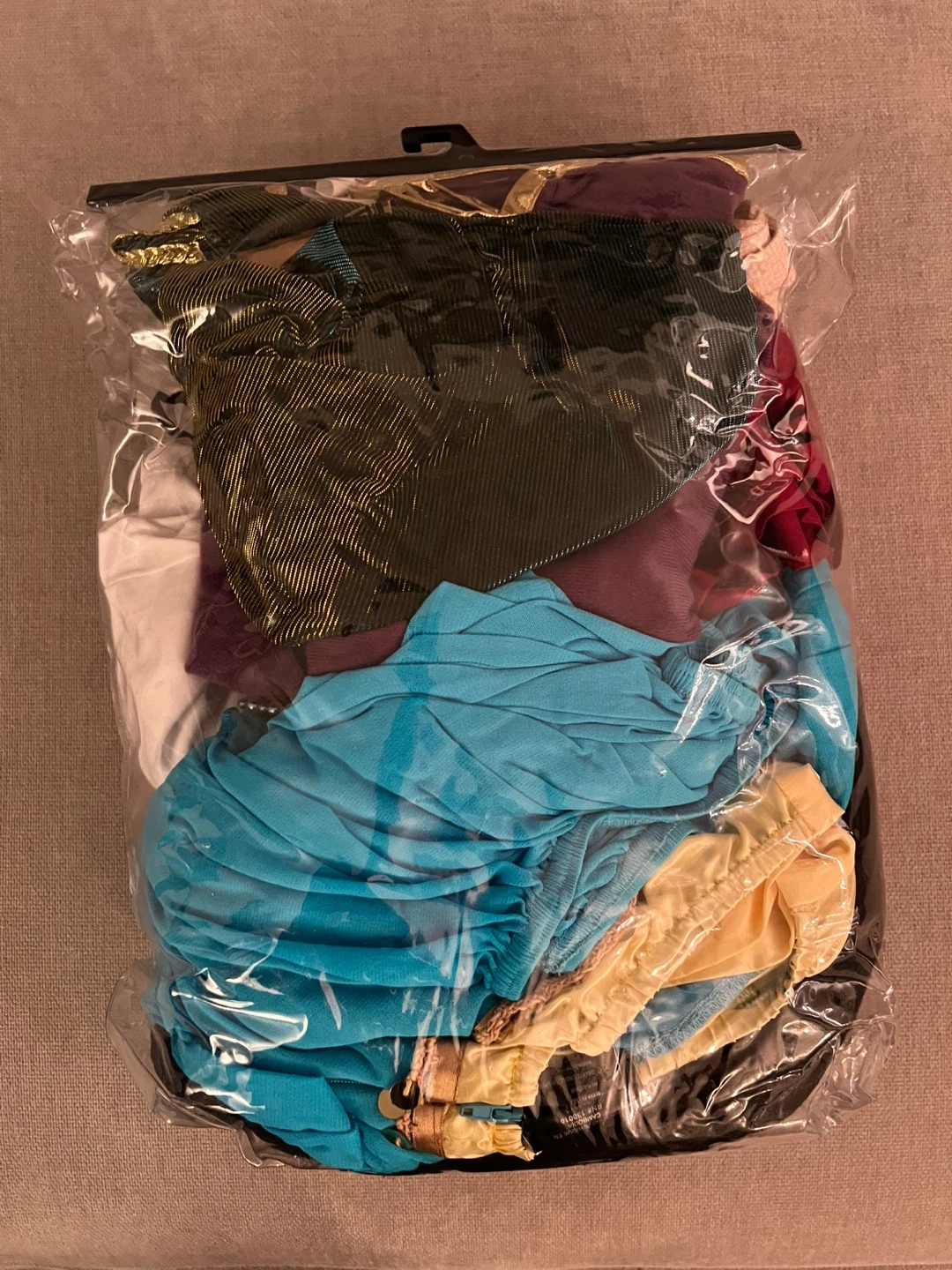 Jasmine costume in size small! It's a beautiful turquoise colour and includes the top, harem pants, and a headband with a wig. The material is 100% nylon. Originally bought for $105