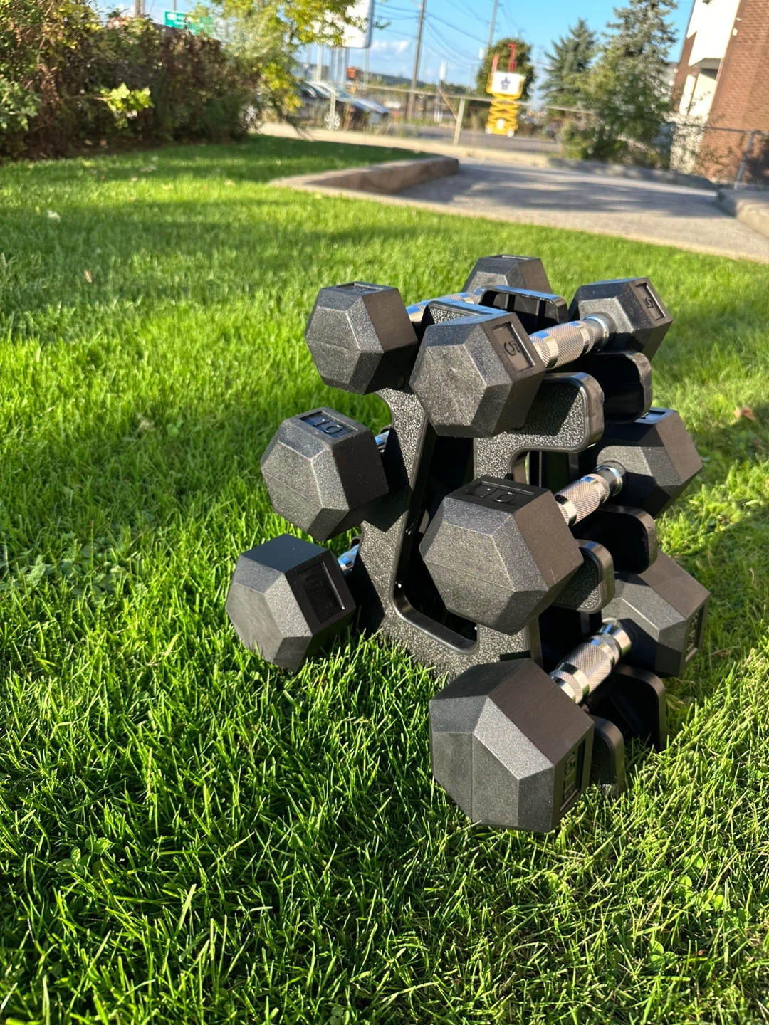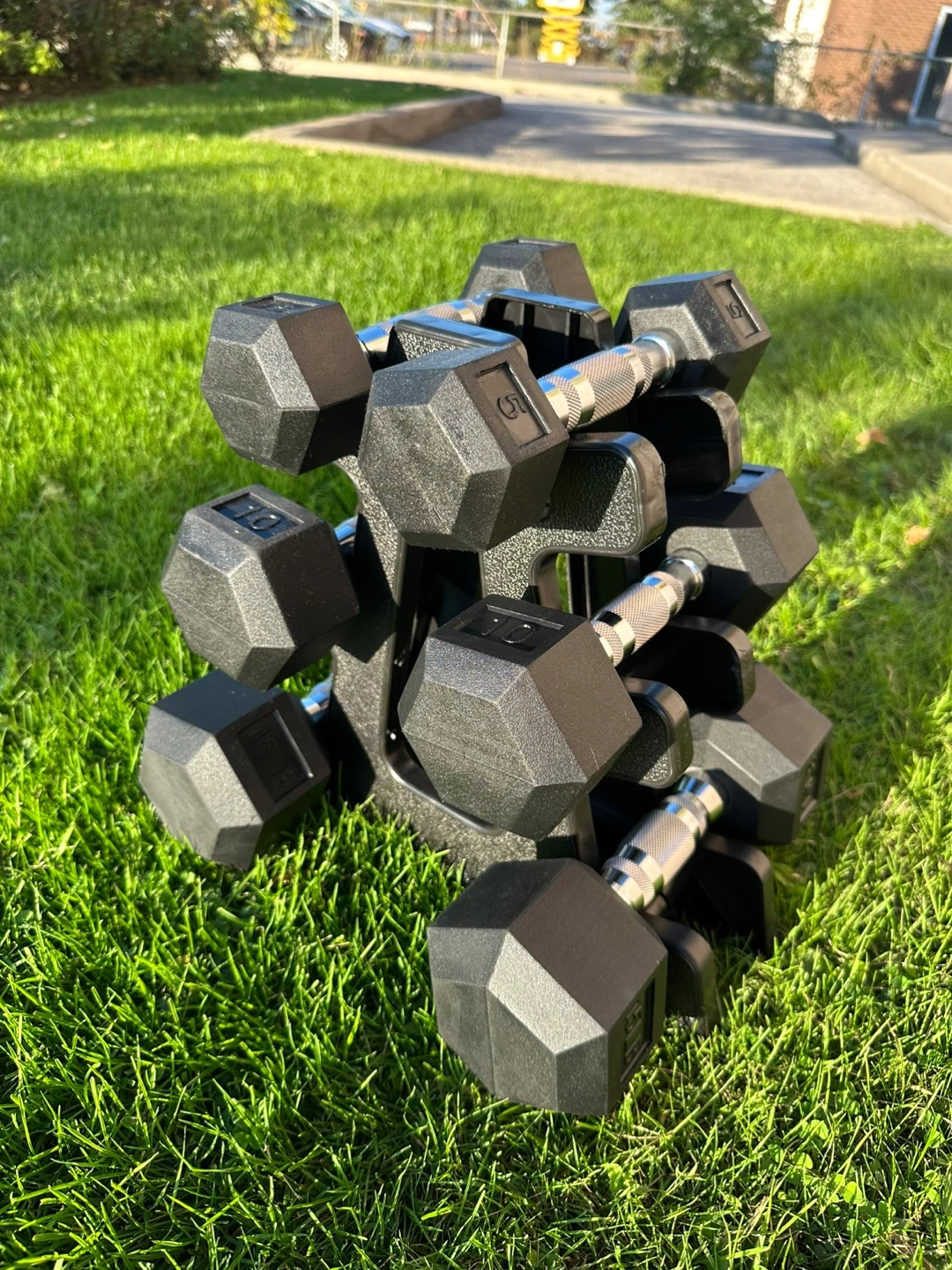 Hex dumbbell set with a handy rack for storage. Includes weights of varying sizes. Chrome handles provide a comfortable grip.