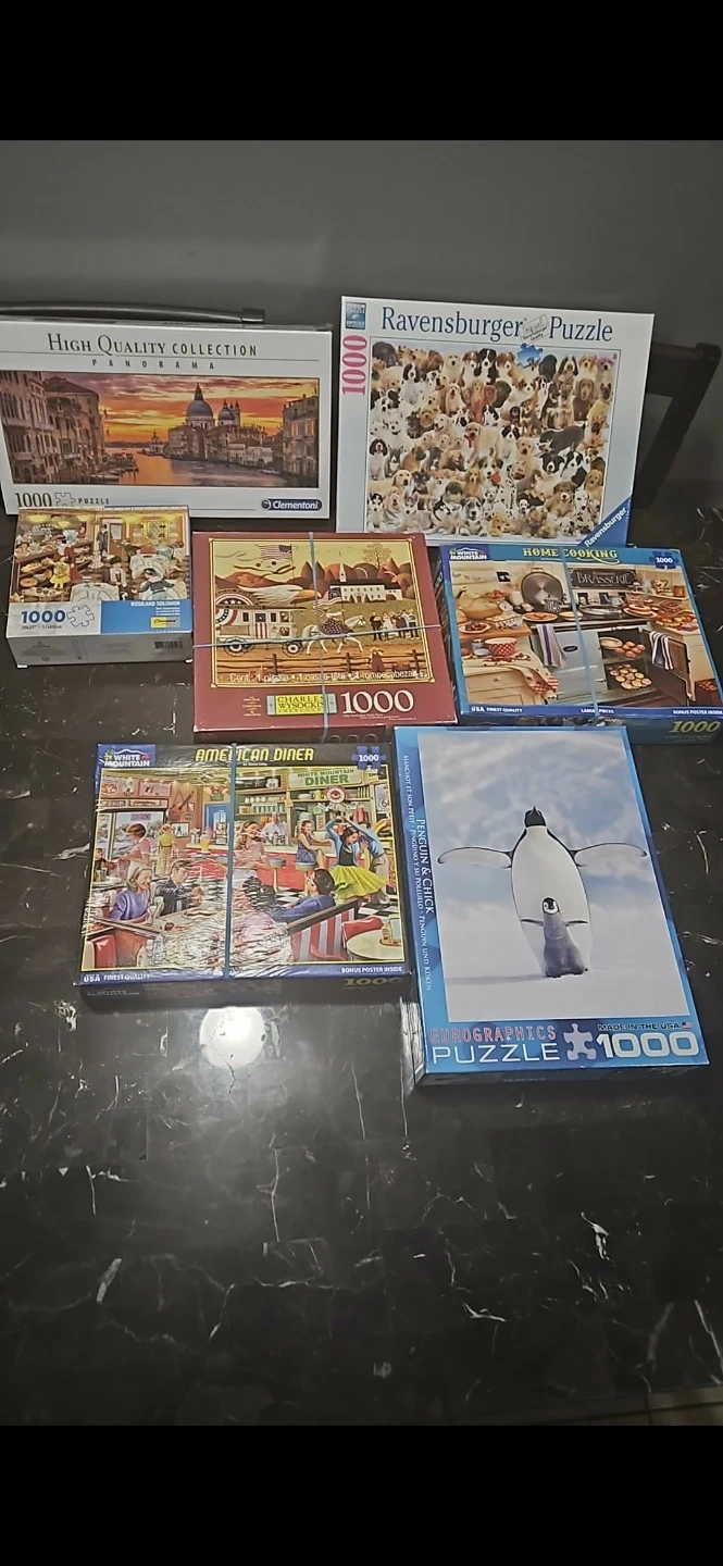 This is a collection of seven 1000-piece jigsaw puzzles. It includes a 'High Quality Collection Panorama' puzzle from Clementoni which is new. A new 'Ravensburger Puzzle' featuring many dogs, and a 'Eurographics' puzzle with a penguin. Other puzzles include 'American Diner' by White Mountain, 'Home Cooking', and two others with scenic and vintage themes. These puzzles are great for a quiet afternoon or a family activity!