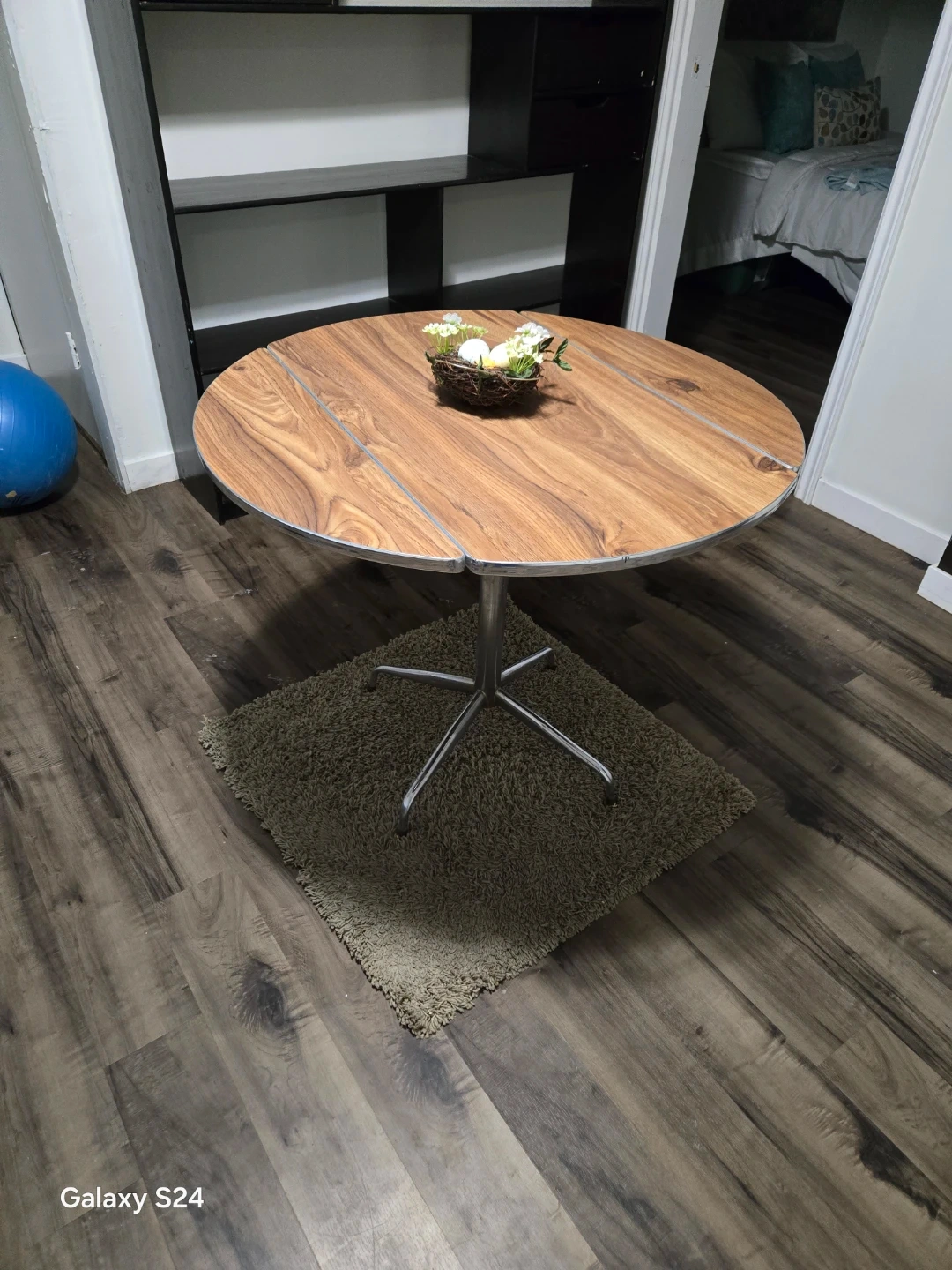 Material: Wood or wood-veneer top with a metal pedestal base