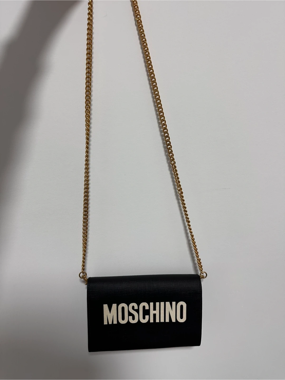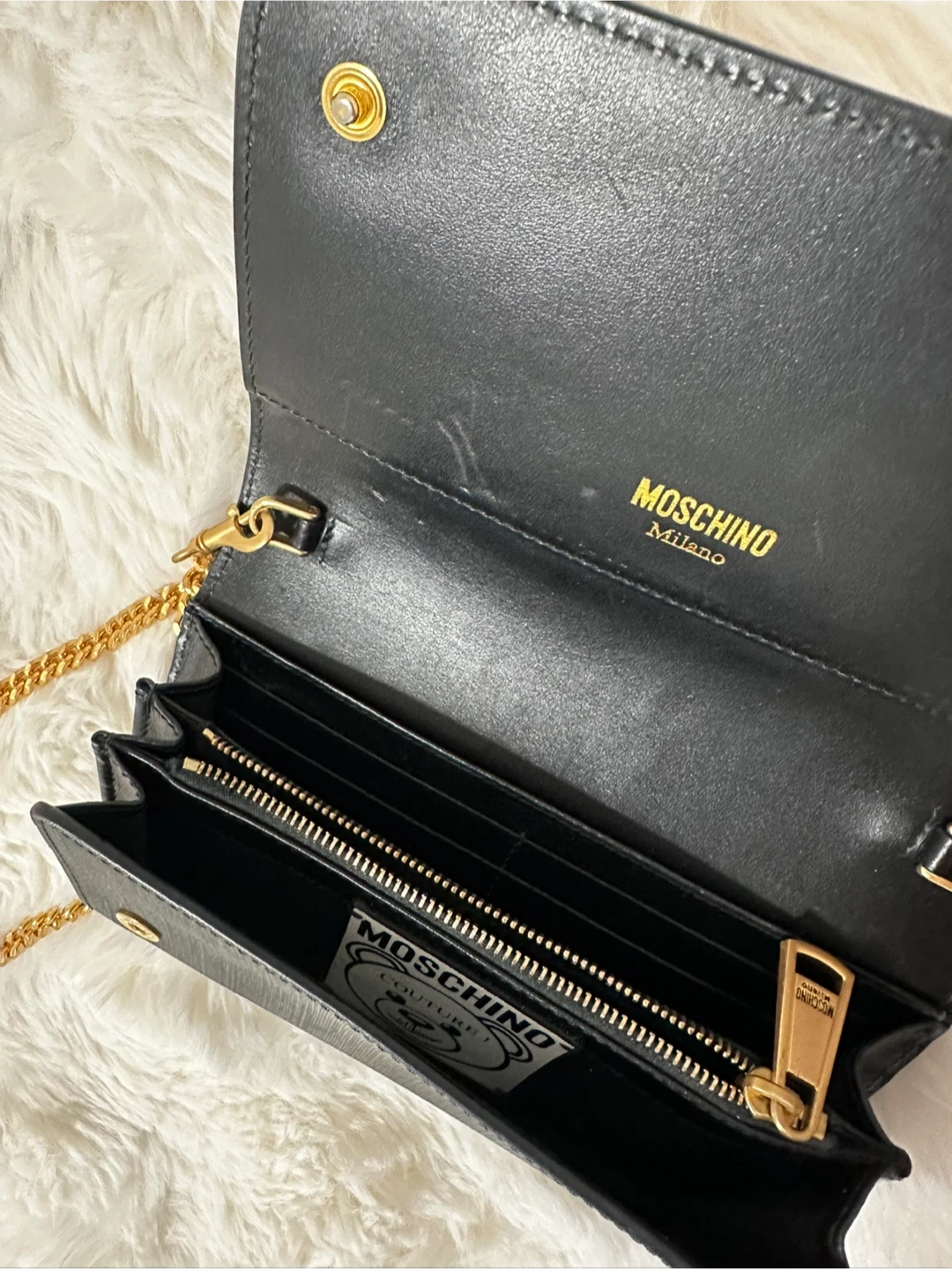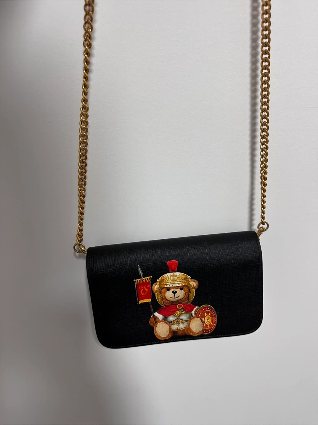 Moschino black wallet with a gold chain strap. Features a "MOSCHINO MILANO" logo on the inside and a playful teddy bear graphic dressed as a Roman soldier on the exterior. Includes card slots and a zippered compartment.