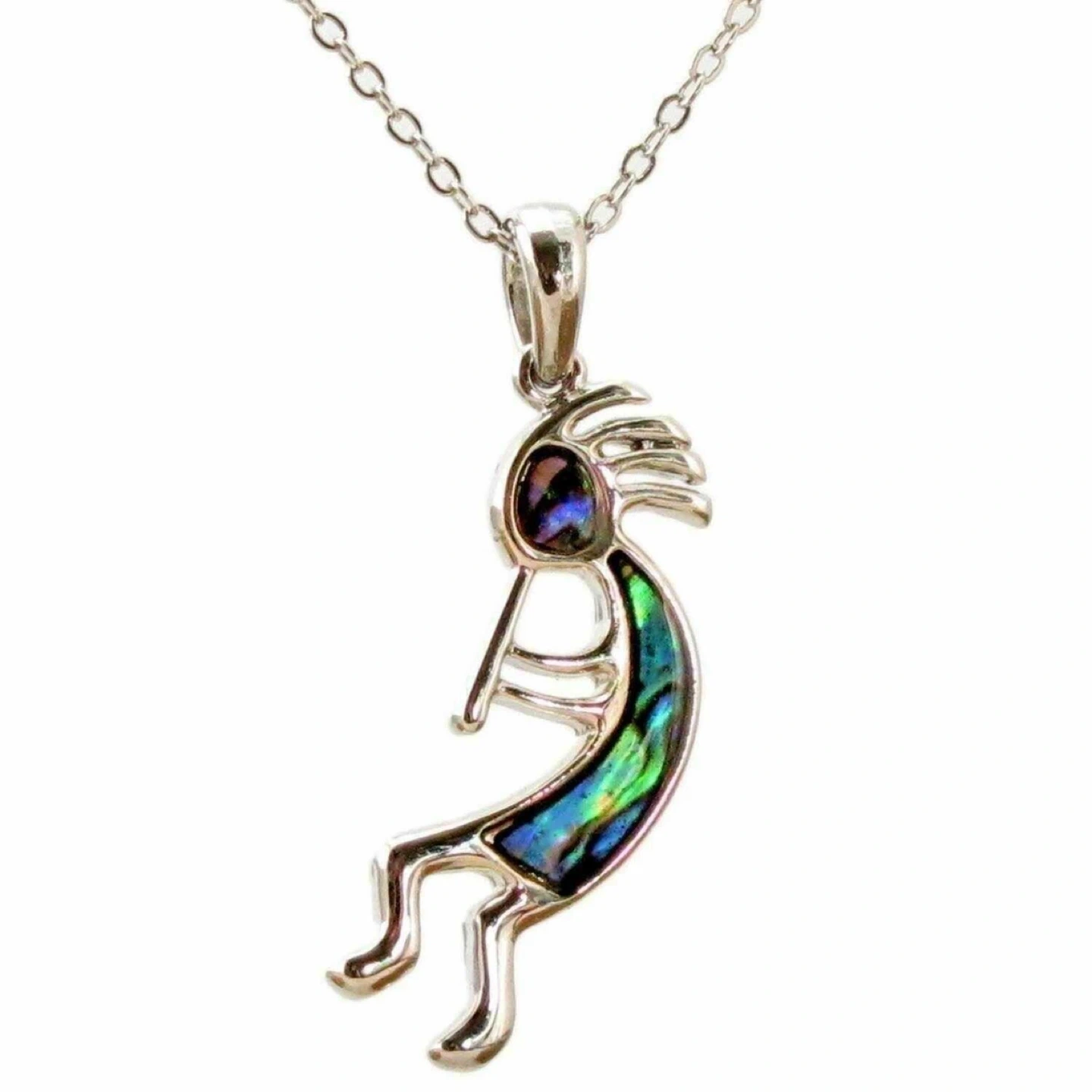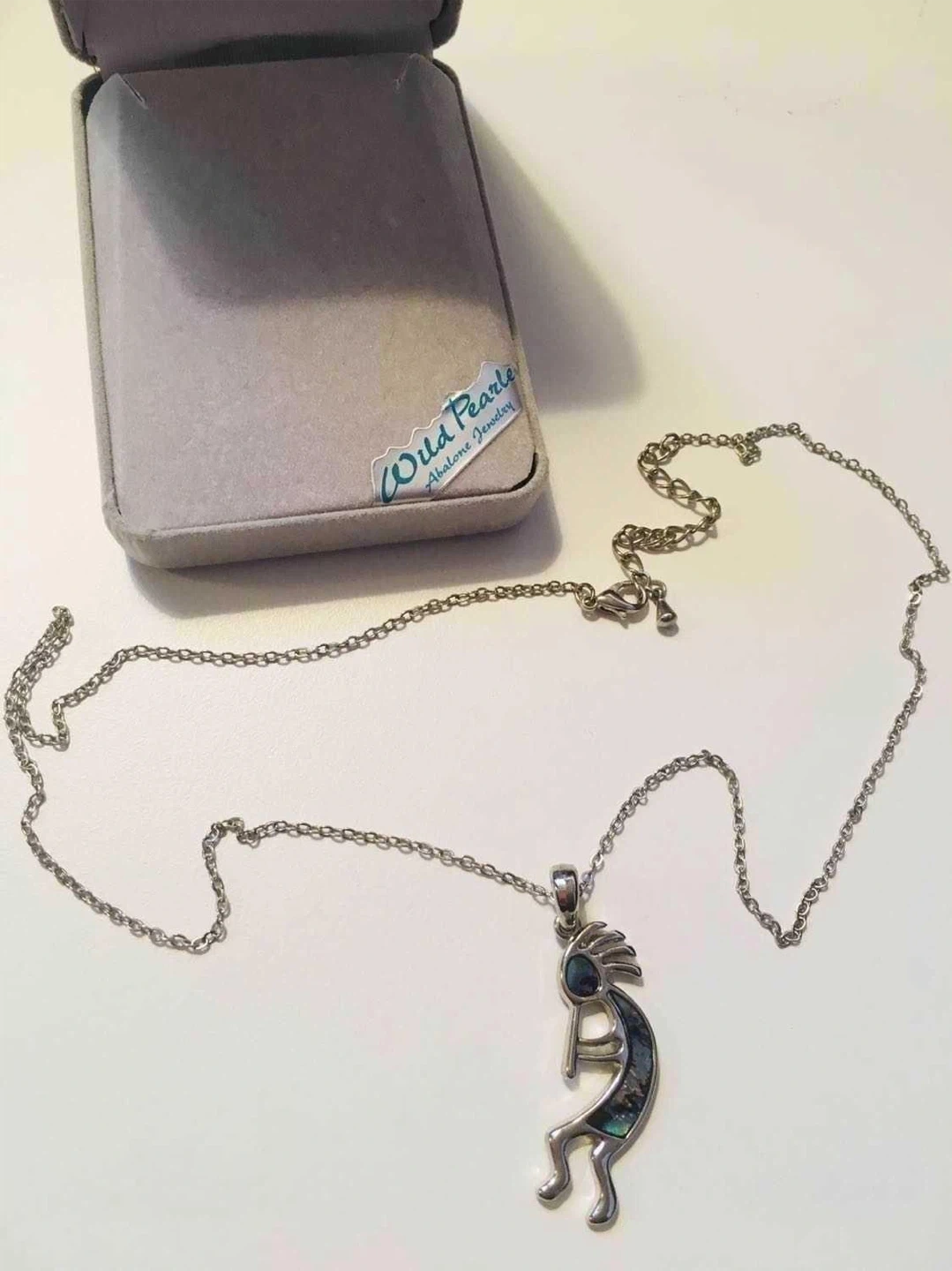 This necklace features a Kokopelli pendant with abalone inlay. It comes with a chain and its original box. Abalone shell offers iridescent blues and greens.