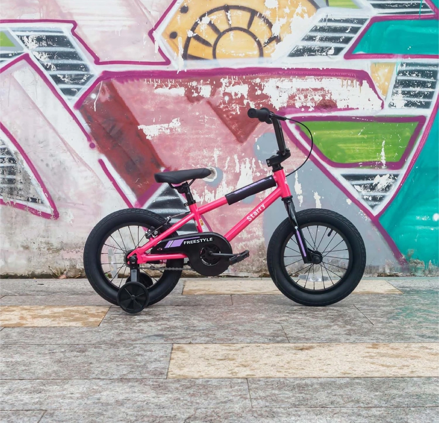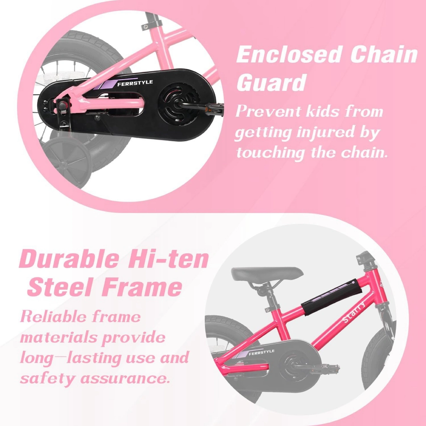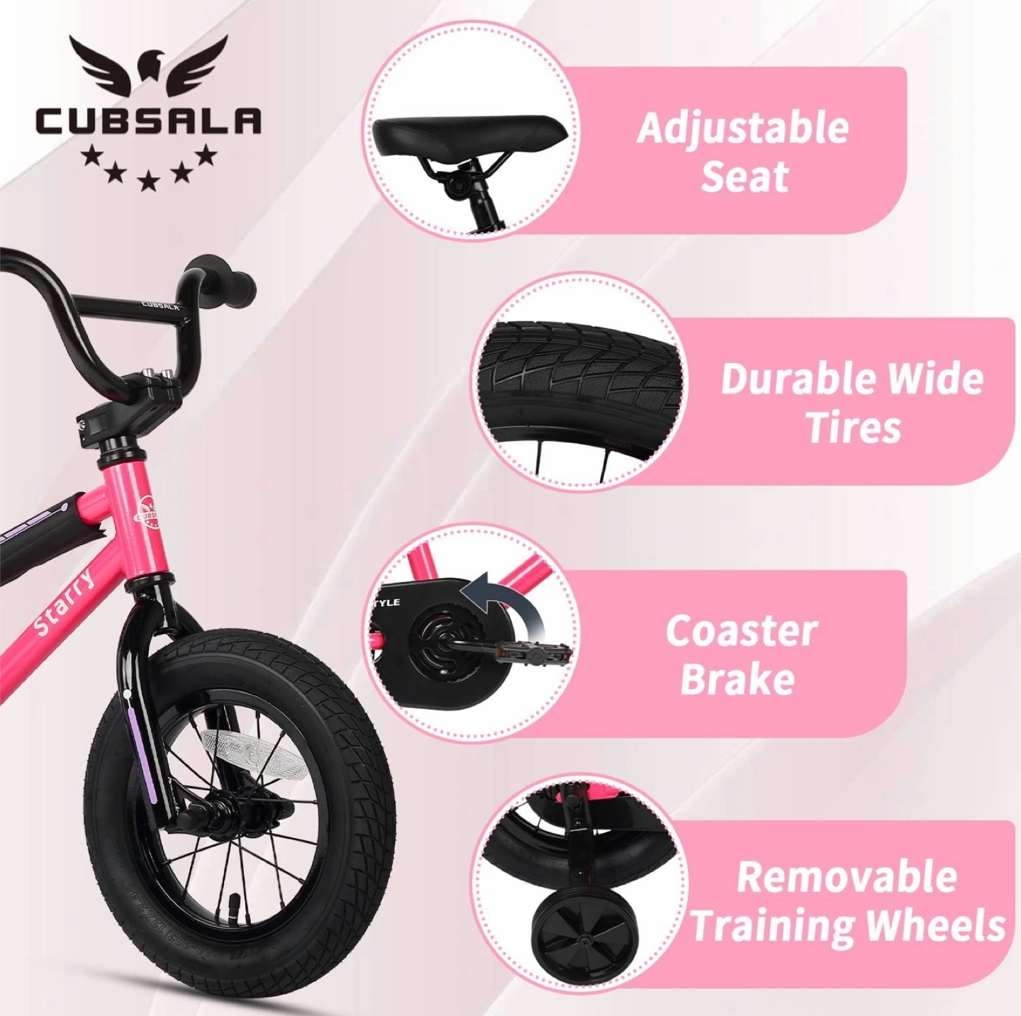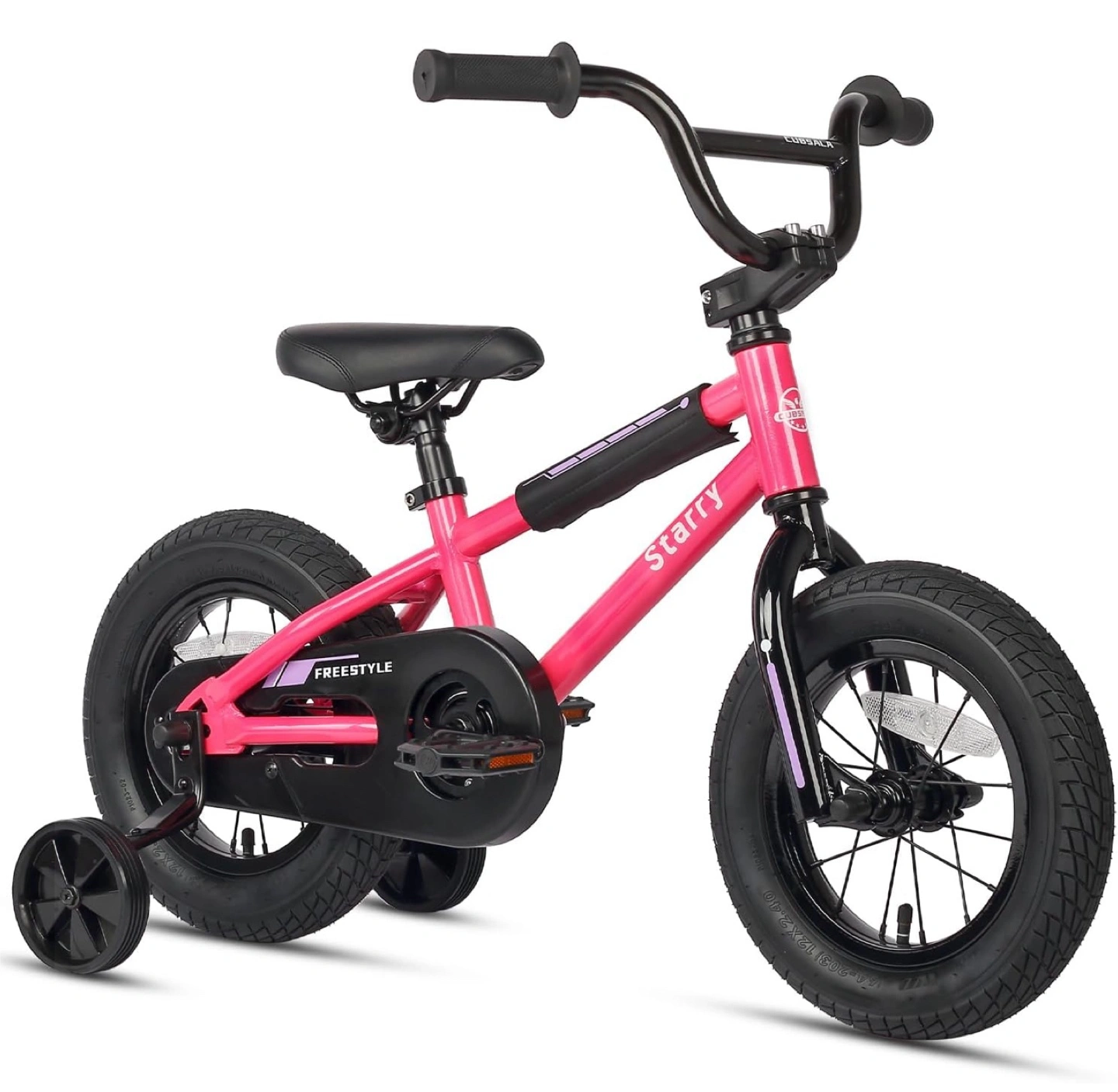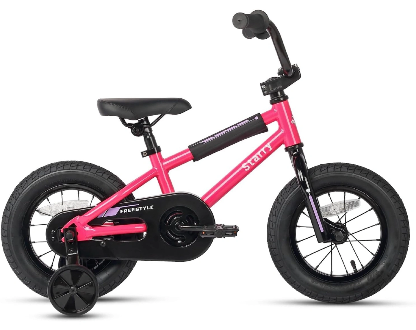 12 Inch Kids Bike BMX Style Bicycle with Training Wheels Height adjustable saddle Made of high-ten carbon steel Chain guard protects Coaster brake system is more suitable for young riders who may not have enough strength to operate hand brakes NOTE: New in box, Pink color