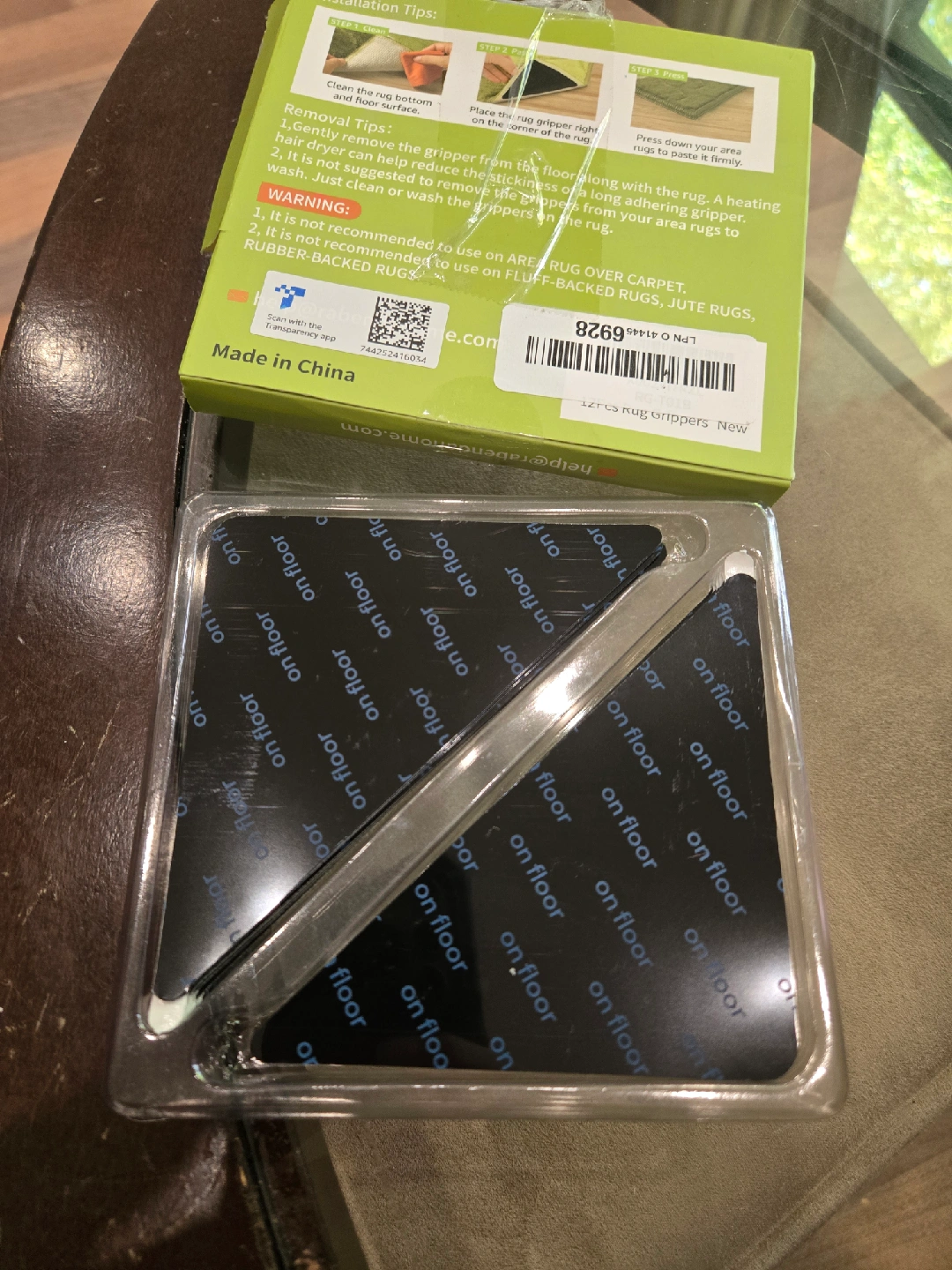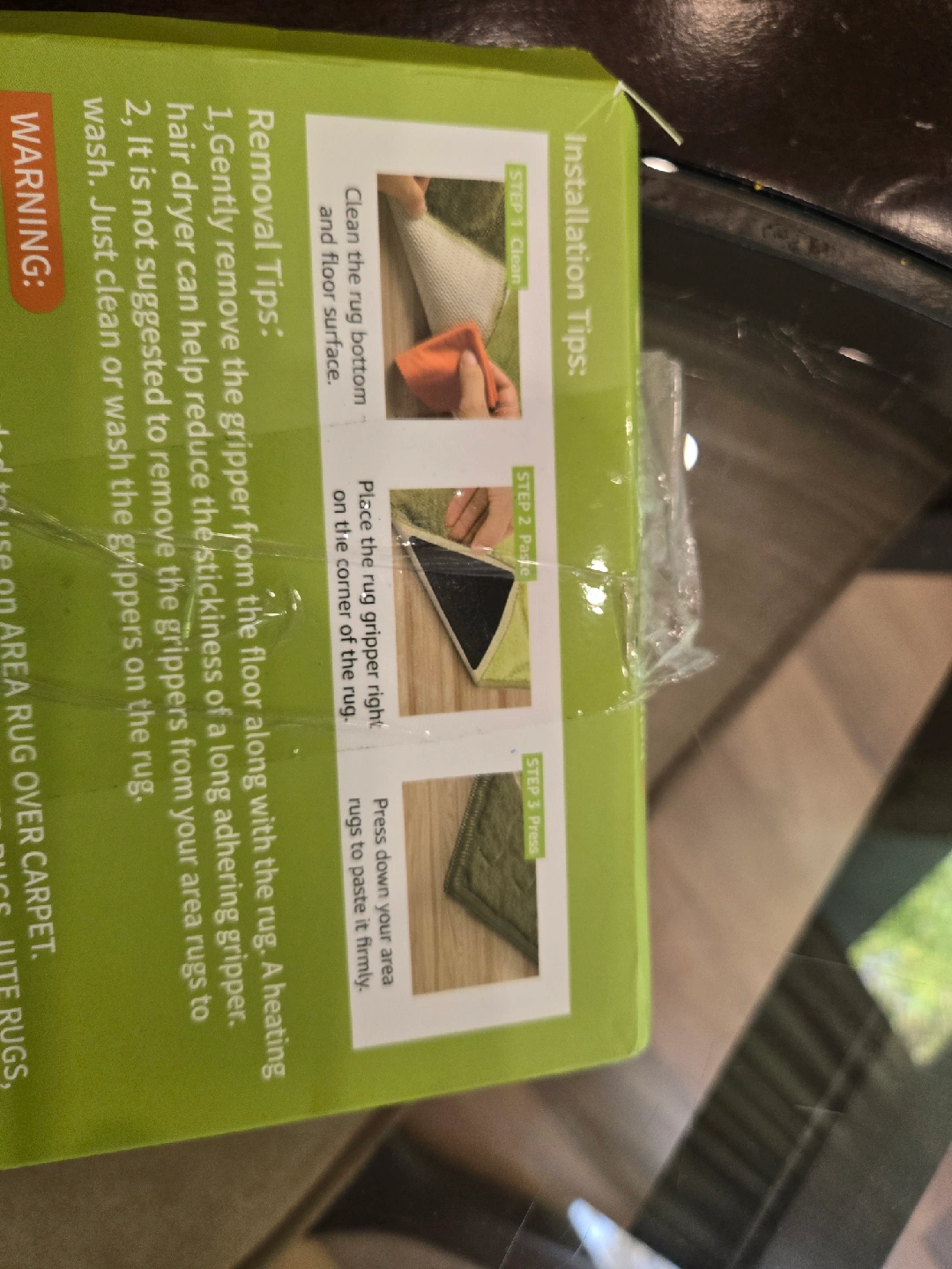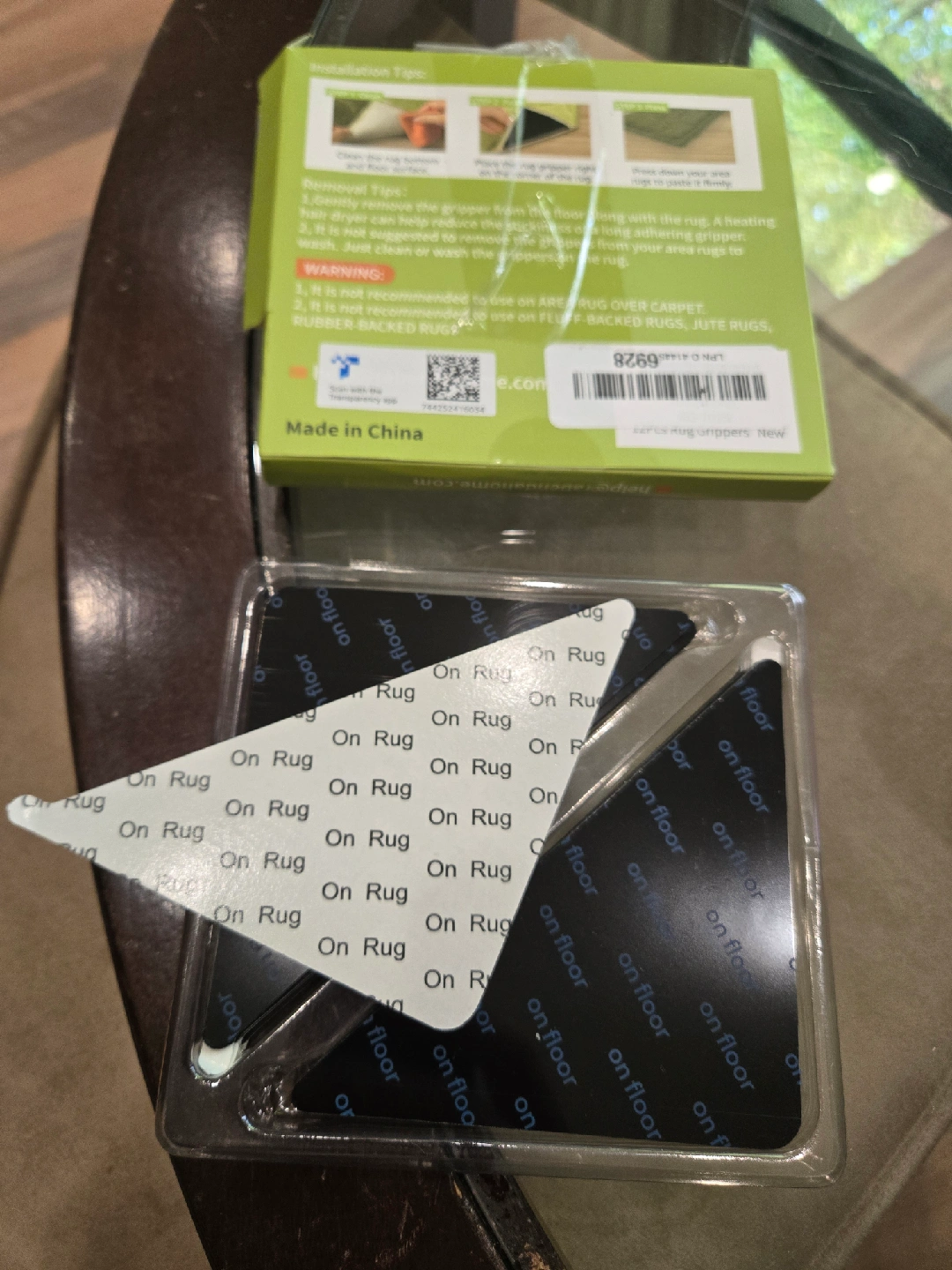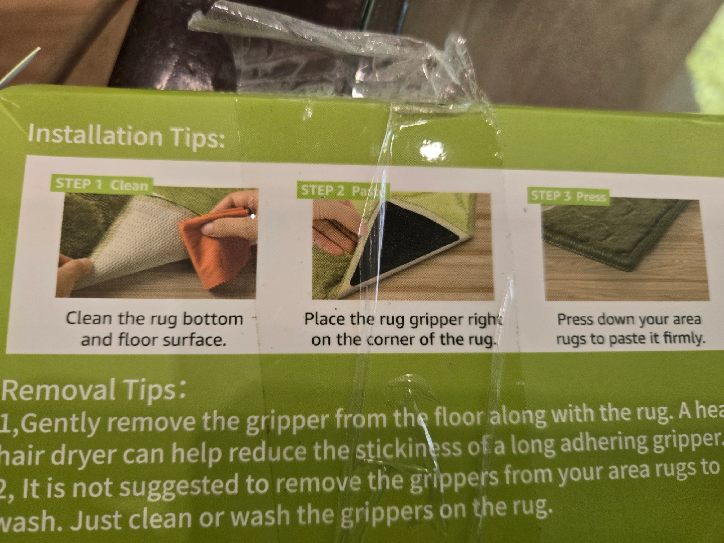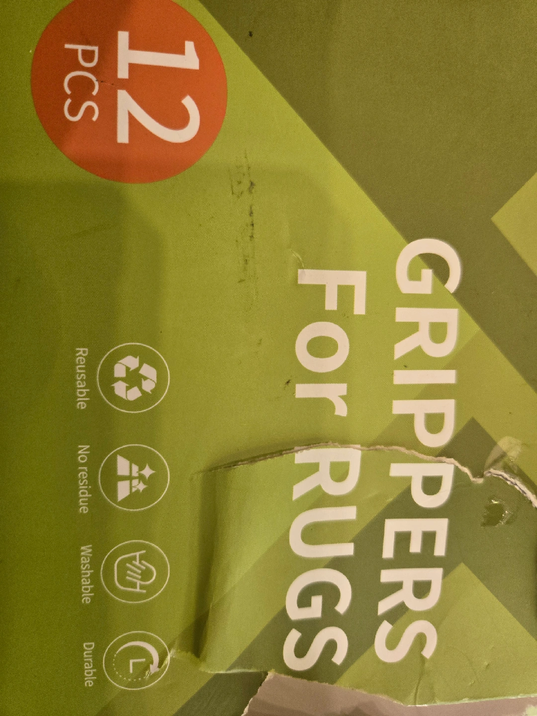 Selling a pack of 12 rug grippers, perfect for keeping your rugs in place! They are reusable, leave no residue, washable, and durable. Installation is easy: just clean the rug bottom and floor surface, place the rug gripper on the corner, and press down firmly! Includes installation tips on the box