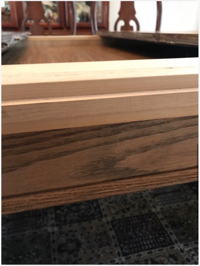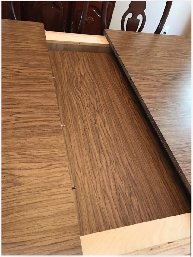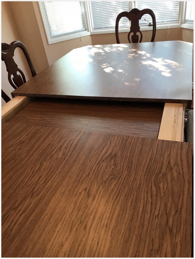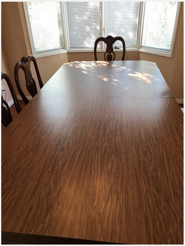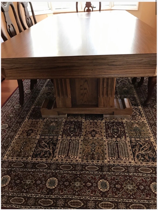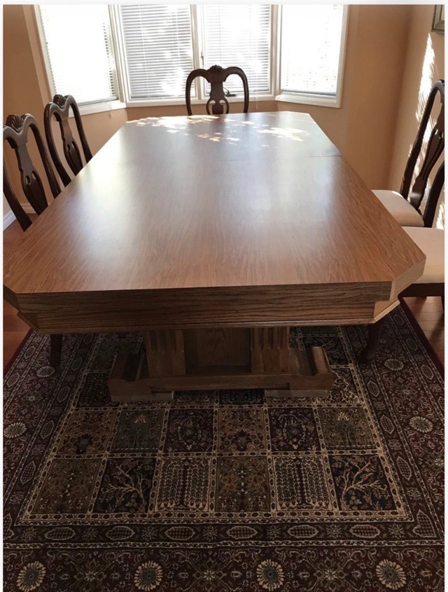 This is a custom made dinning table. Solid Oak base and frame with a color coded easy to clean, scratch resistant laminate table top. 4 ft by 8 feet without extension. 12 ft long with extension. Can seat 12 comfortably without extension and up to 16 with extension. No chairs, table only. Pick up only! West Edmonton pick up.