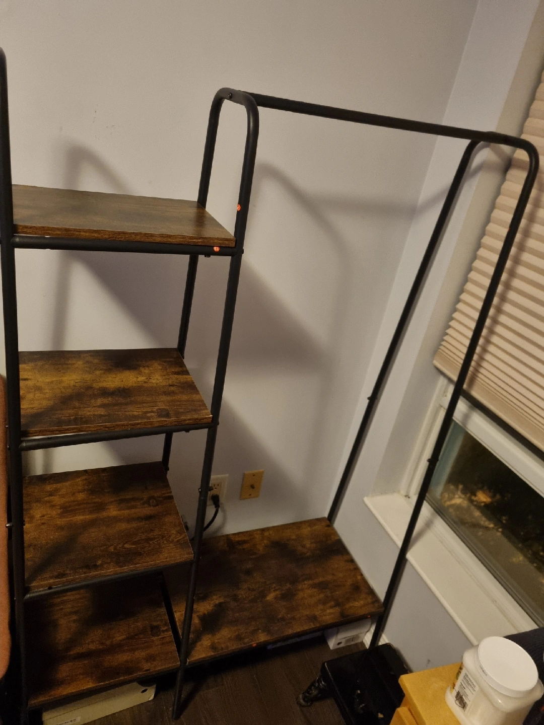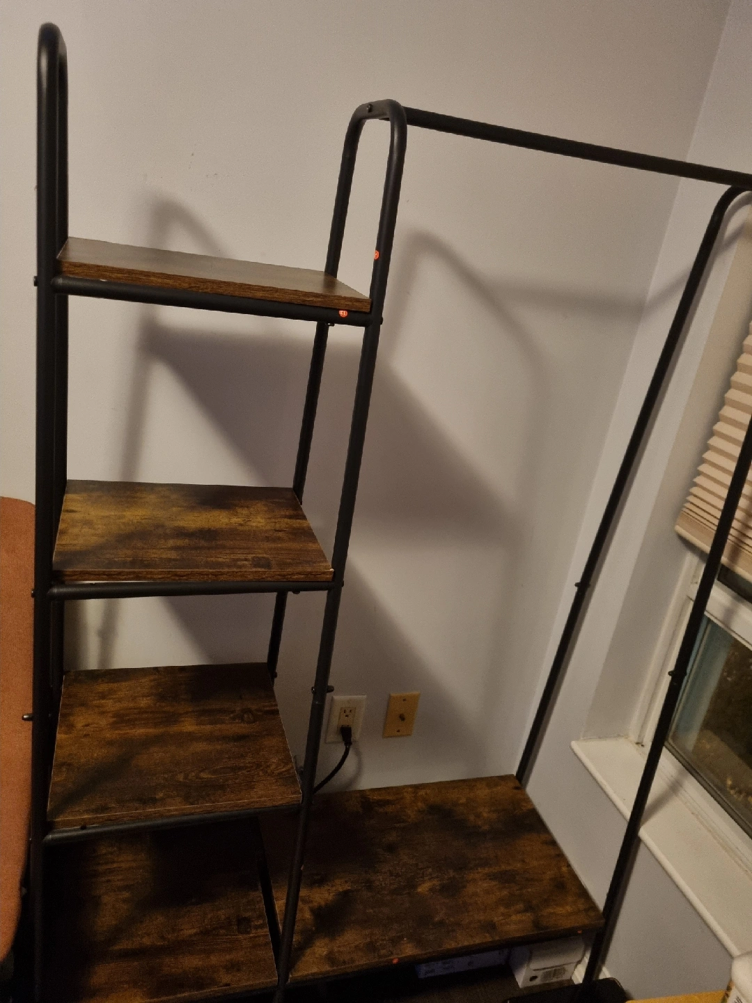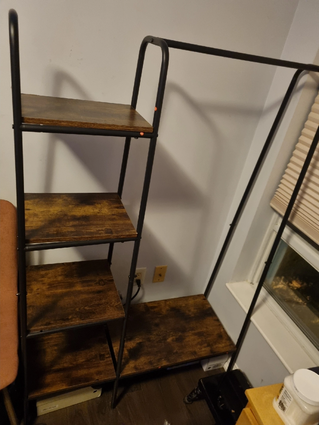 Selling a clothing rack with shelves! It's in great condition and would be perfect for adding extra storage to a bedroom or closet. The shelves are a nice wood-look finish and the frame is black metal. It's a stylish and functional piece!