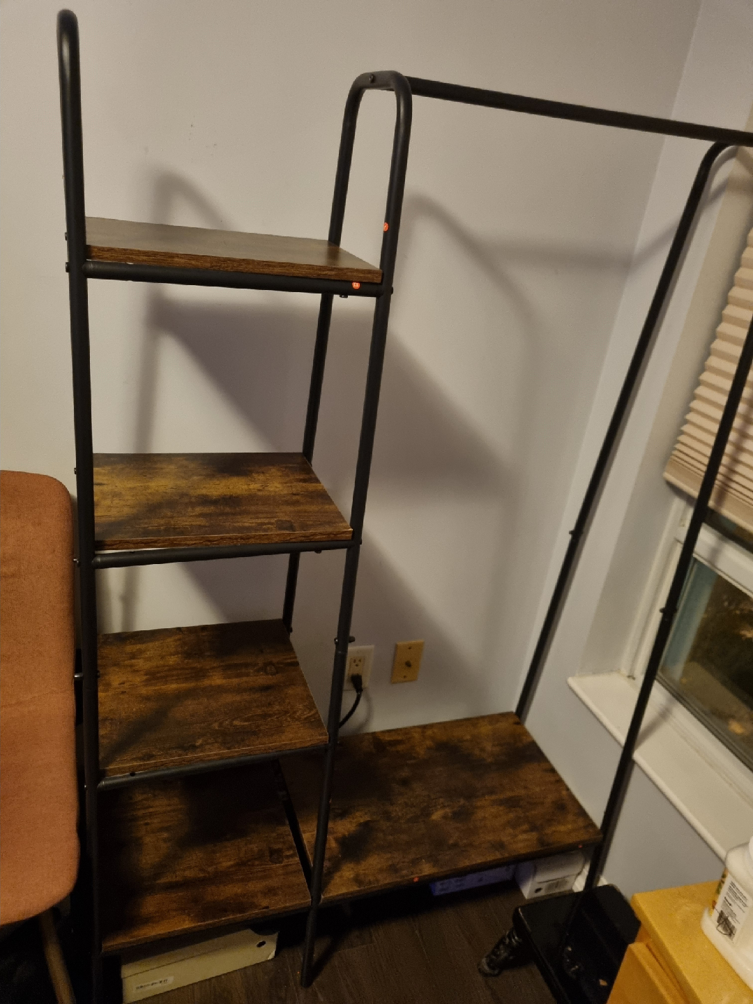 Selling a clothing rack with shelves! It's in great condition and would be perfect for adding extra storage to a bedroom or closet. The shelves are a nice wood-look finish and the frame is black metal. It's a stylish and functional piece!