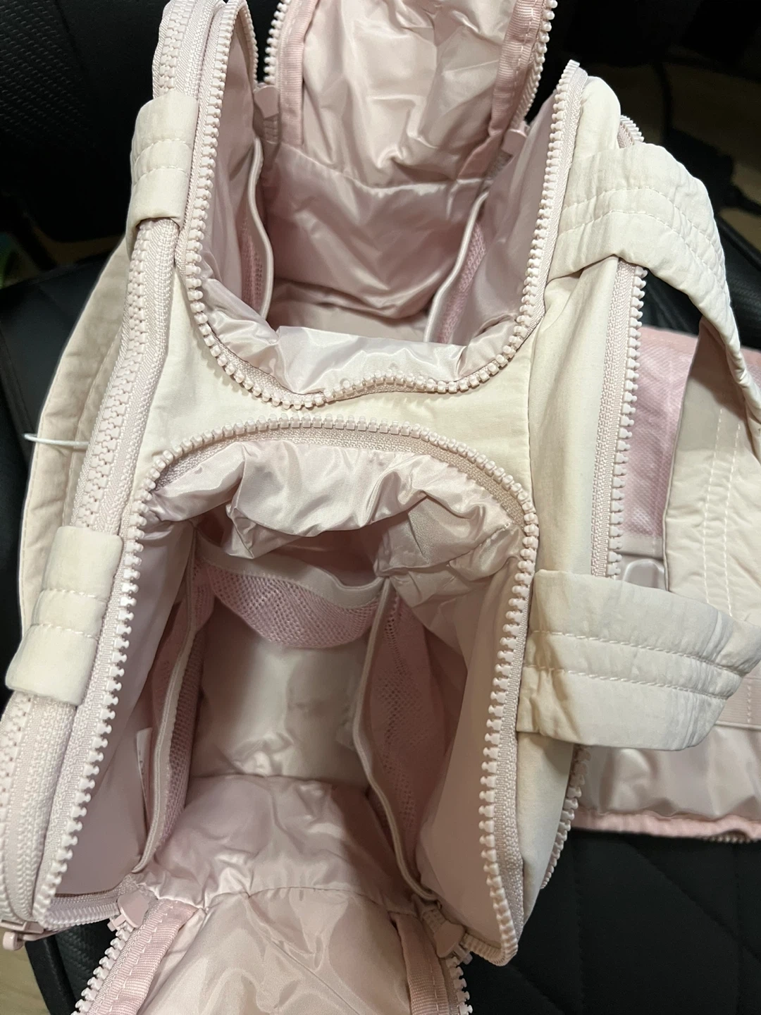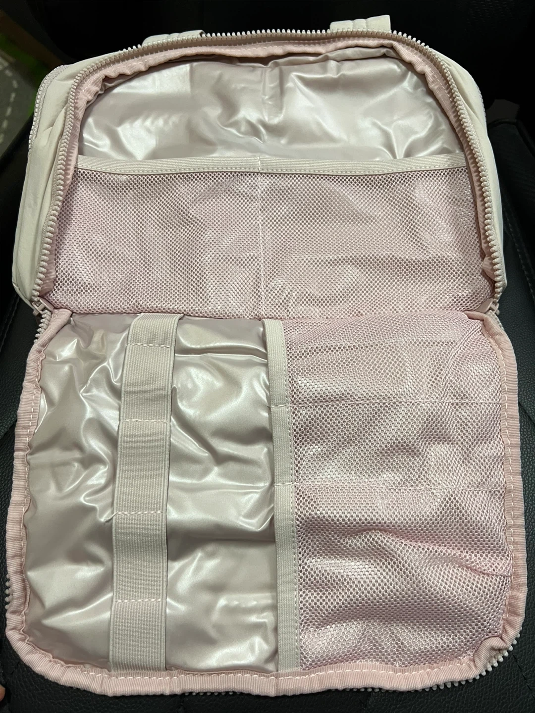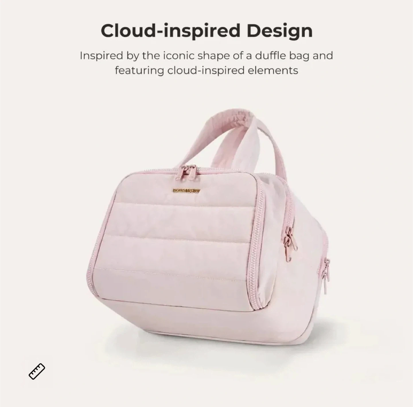 Quilted toiletry bag in a light pink colour. It's made from nylon and polyester. Bag dimensions are 11.8"/30cm x 7.3"/18.5cm x 8.3"/21cm. This bag is excellent for travel and organizing your essentials.