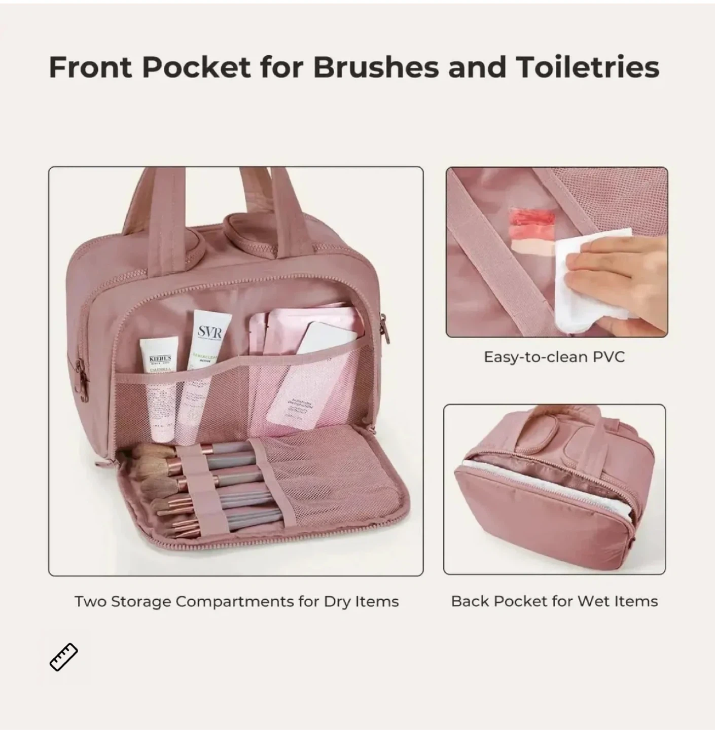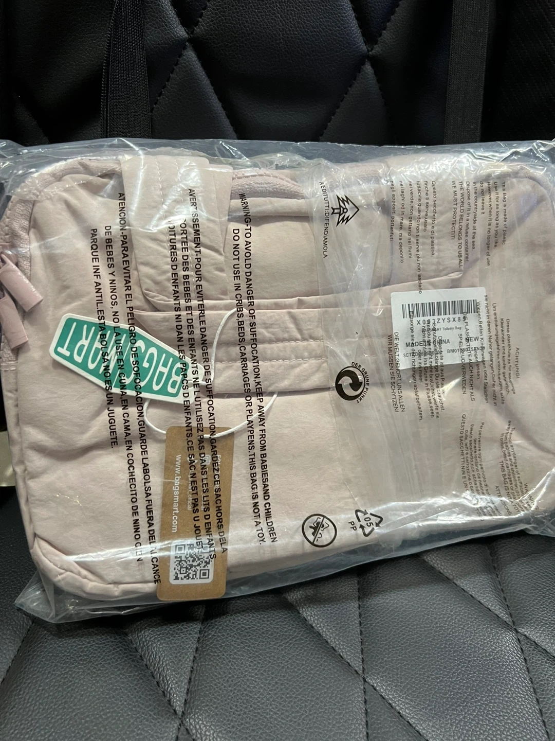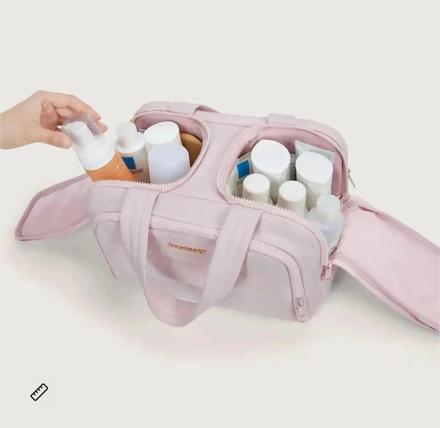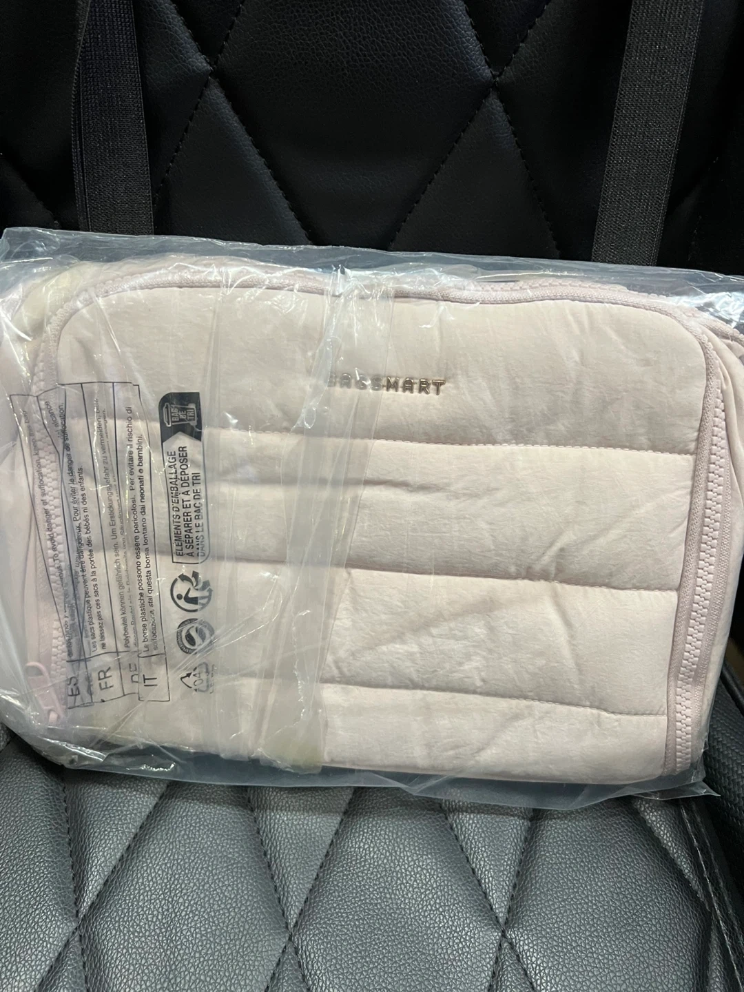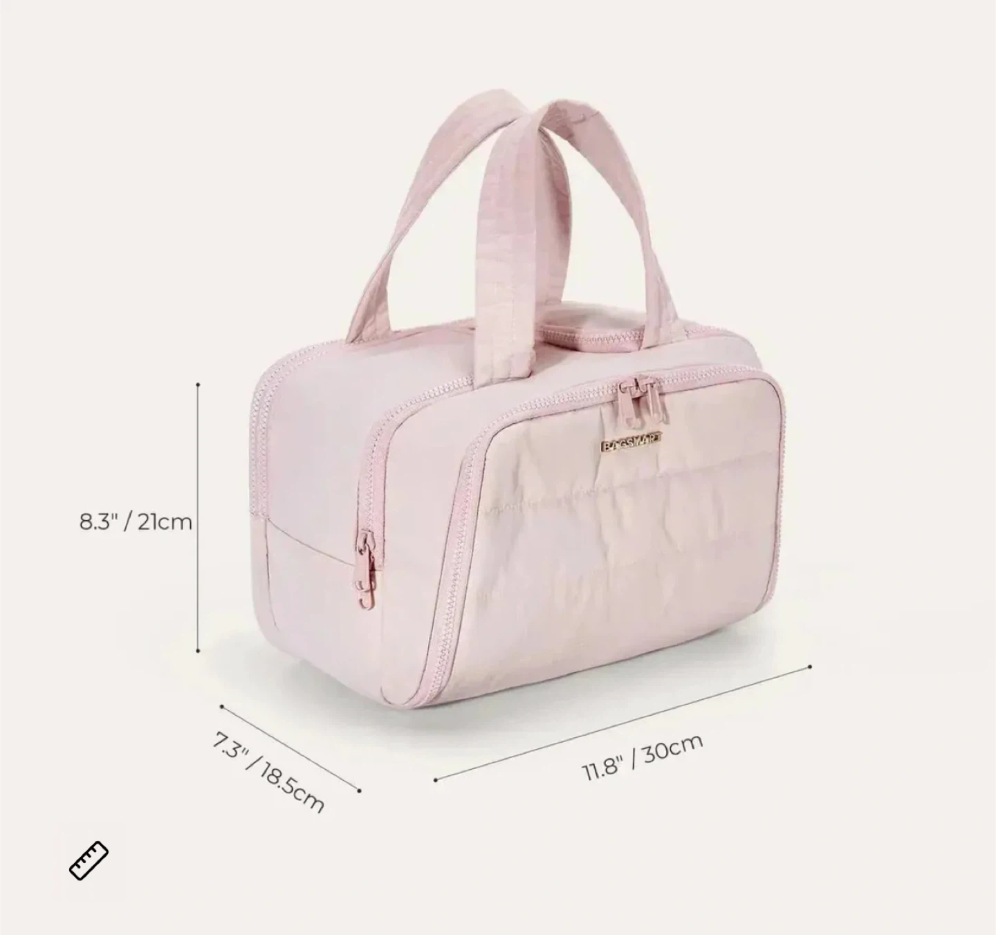 Quilted toiletry bag in a light pink colour. It's made from nylon and polyester. Bag dimensions are 11.8"/30cm x 7.3"/18.5cm x 8.3"/21cm. This bag is excellent for travel and organizing your essentials.