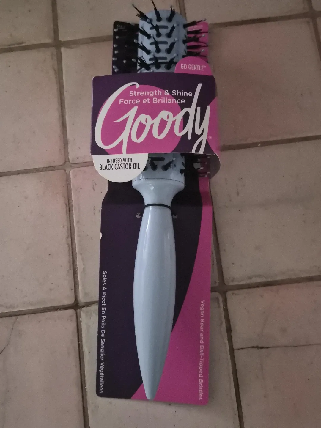 This GoGentle hair brush is infused with black castor oil for strength and shine. It features vegan boar and ball-tipped bristles. This brush is designed for gentle styling.