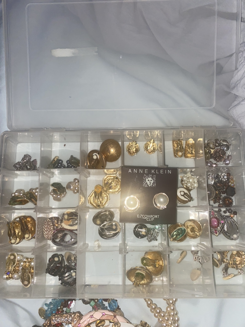 305Earring jewelry box! Vintage earrings😍Each earring sold separately for $5 a piece or whole box for $50 Text me if you want pics of an individual piece.