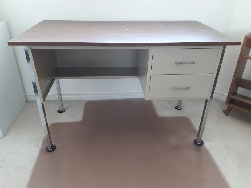 Selling a vintage desk with a brown top and light beige drawers. It features a shelf on one side and two drawers on the other. The legs are chrome. It's a sturdy desk that would be perfect for a home office or student!