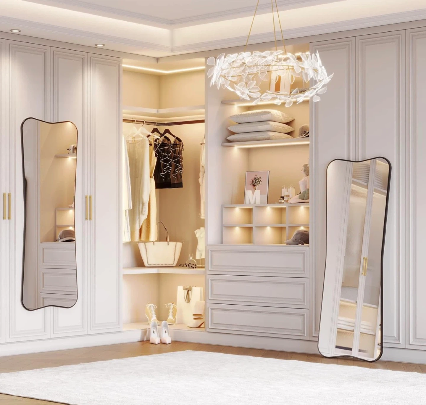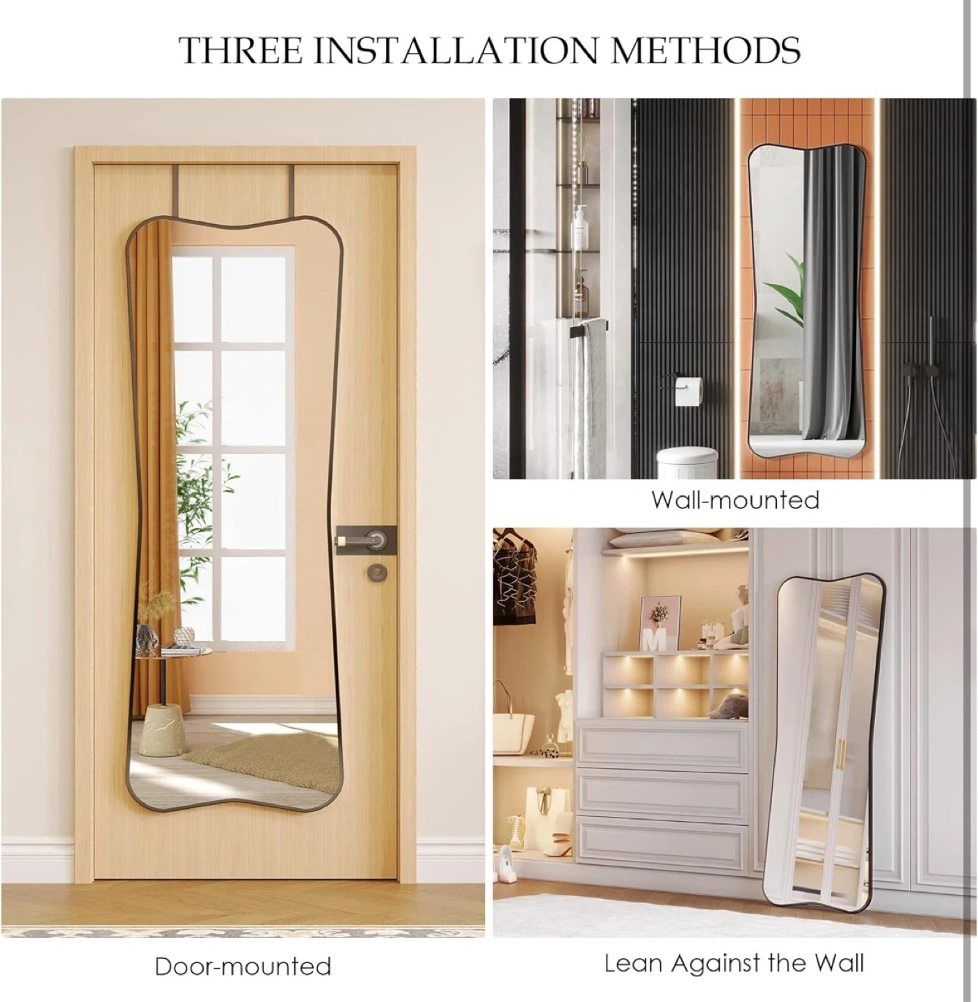 This full-length mirror features a unique, irregular wavy shape and a sleek black frame. It can be door-mounted, wall-mounted, or leaned against a wall. Its distinctive design adds a touch of artistry to any room!