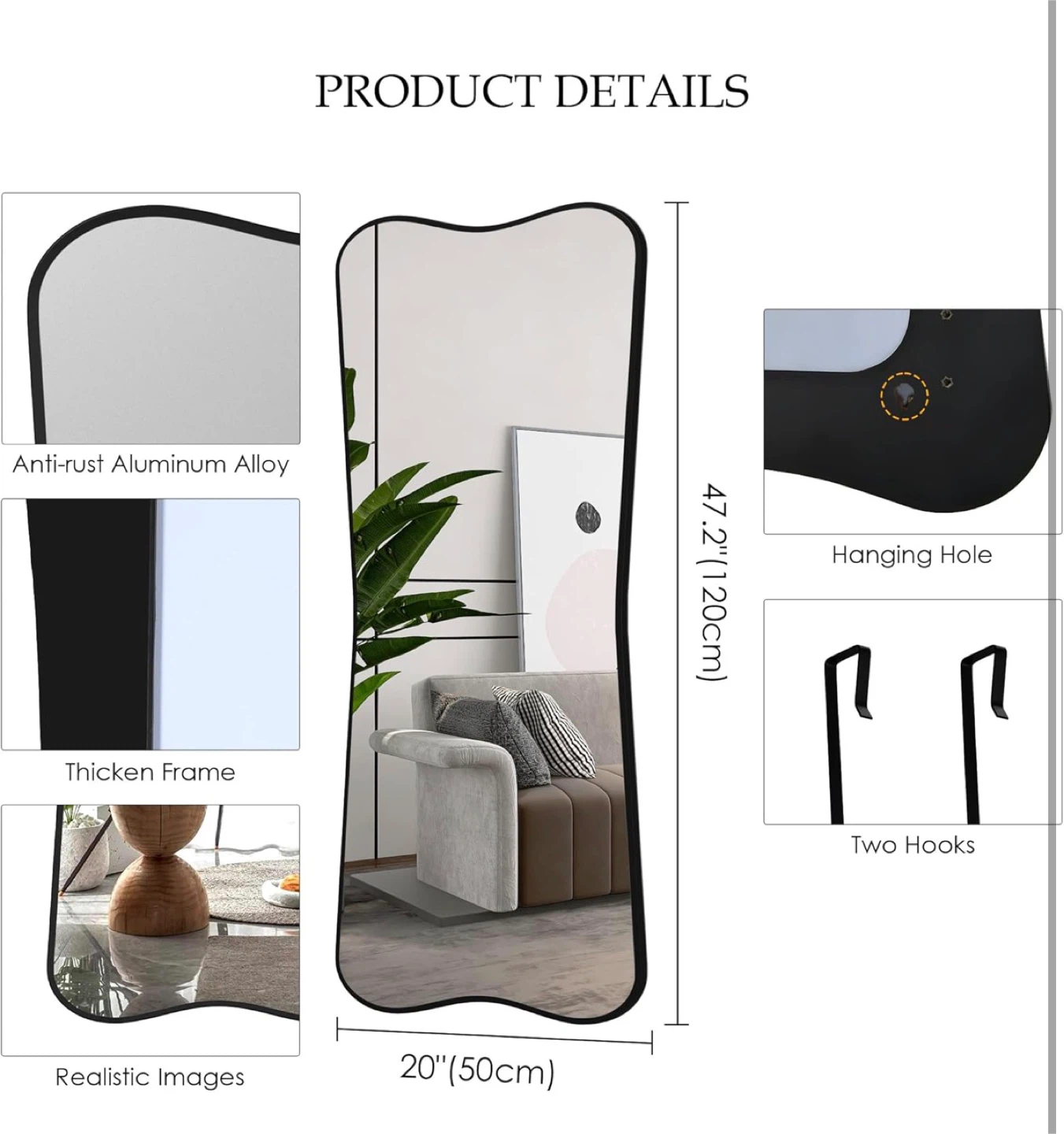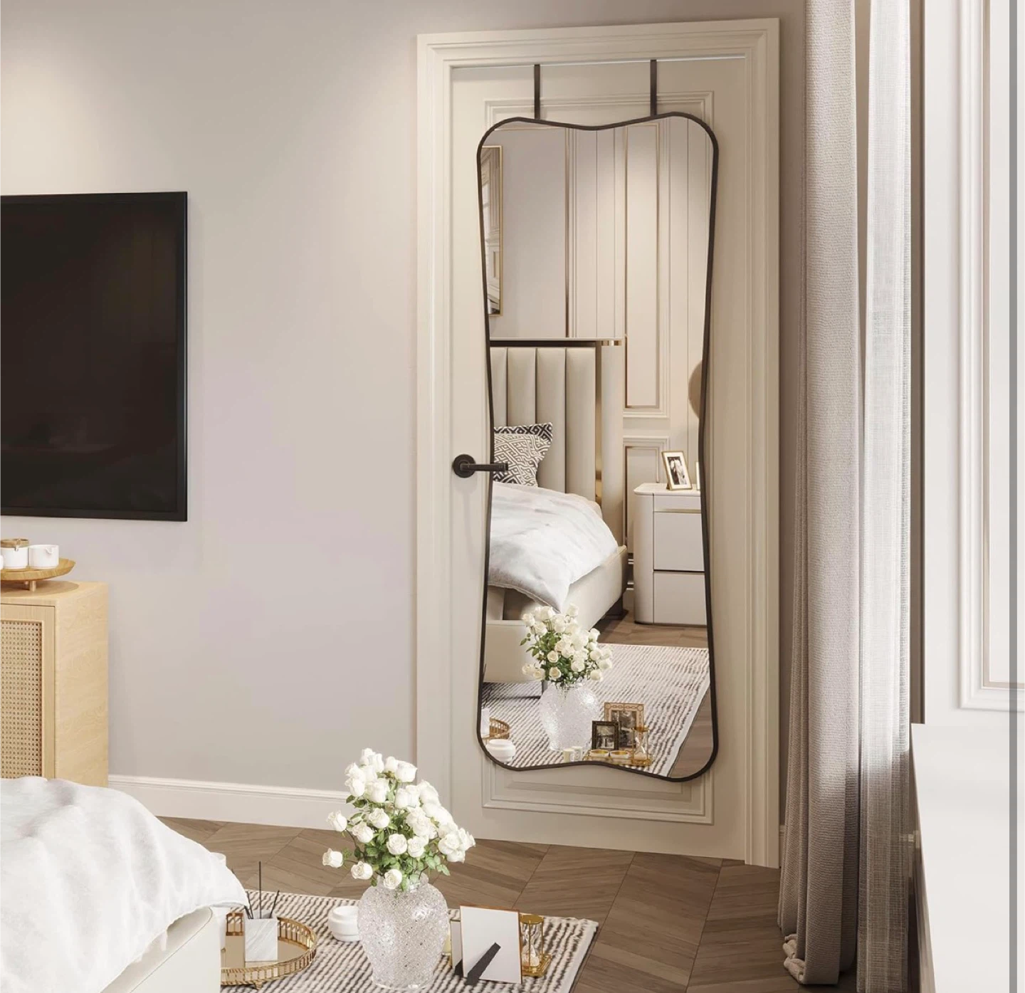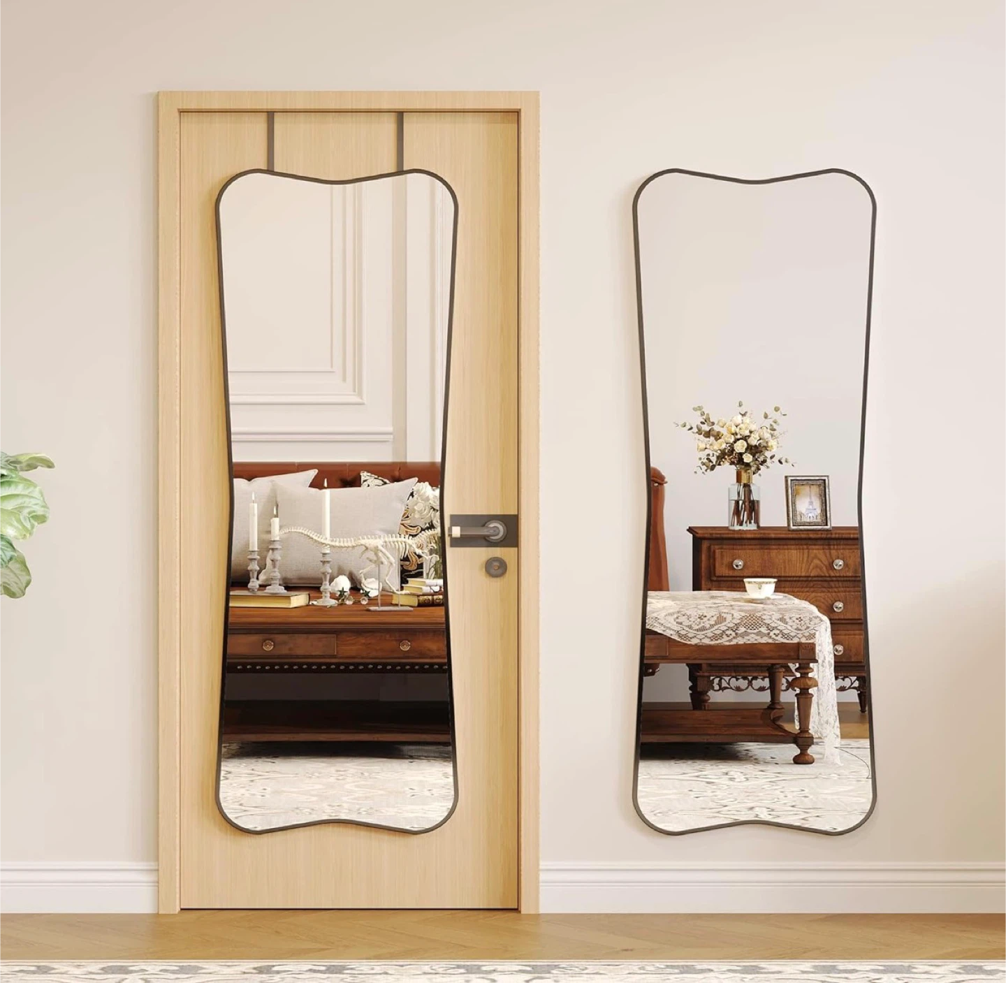 This full-length mirror features a unique, irregular wavy shape and a sleek black frame. It can be door-mounted, wall-mounted, or leaned against a wall. Its distinctive design adds a touch of artistry to any room!