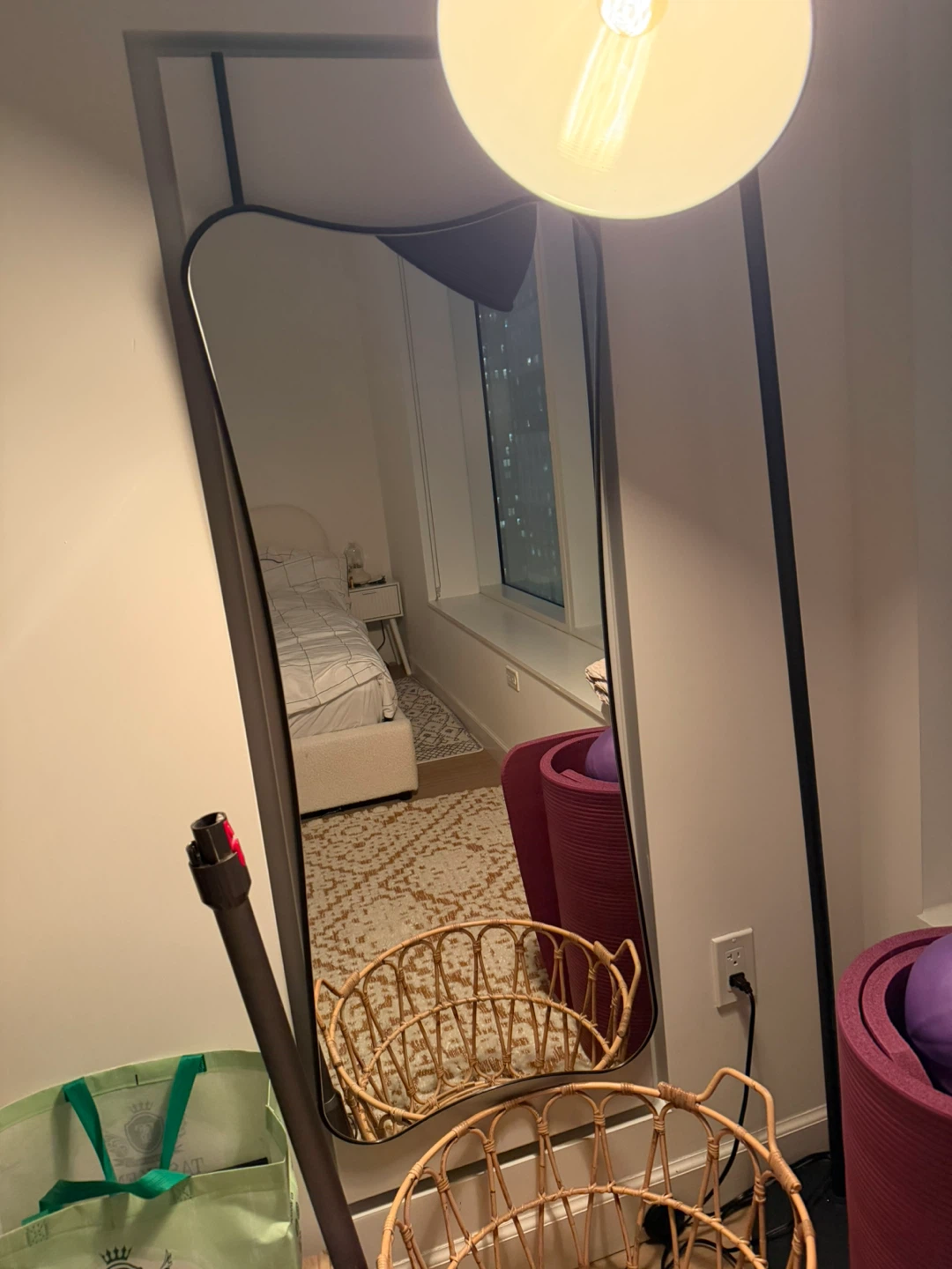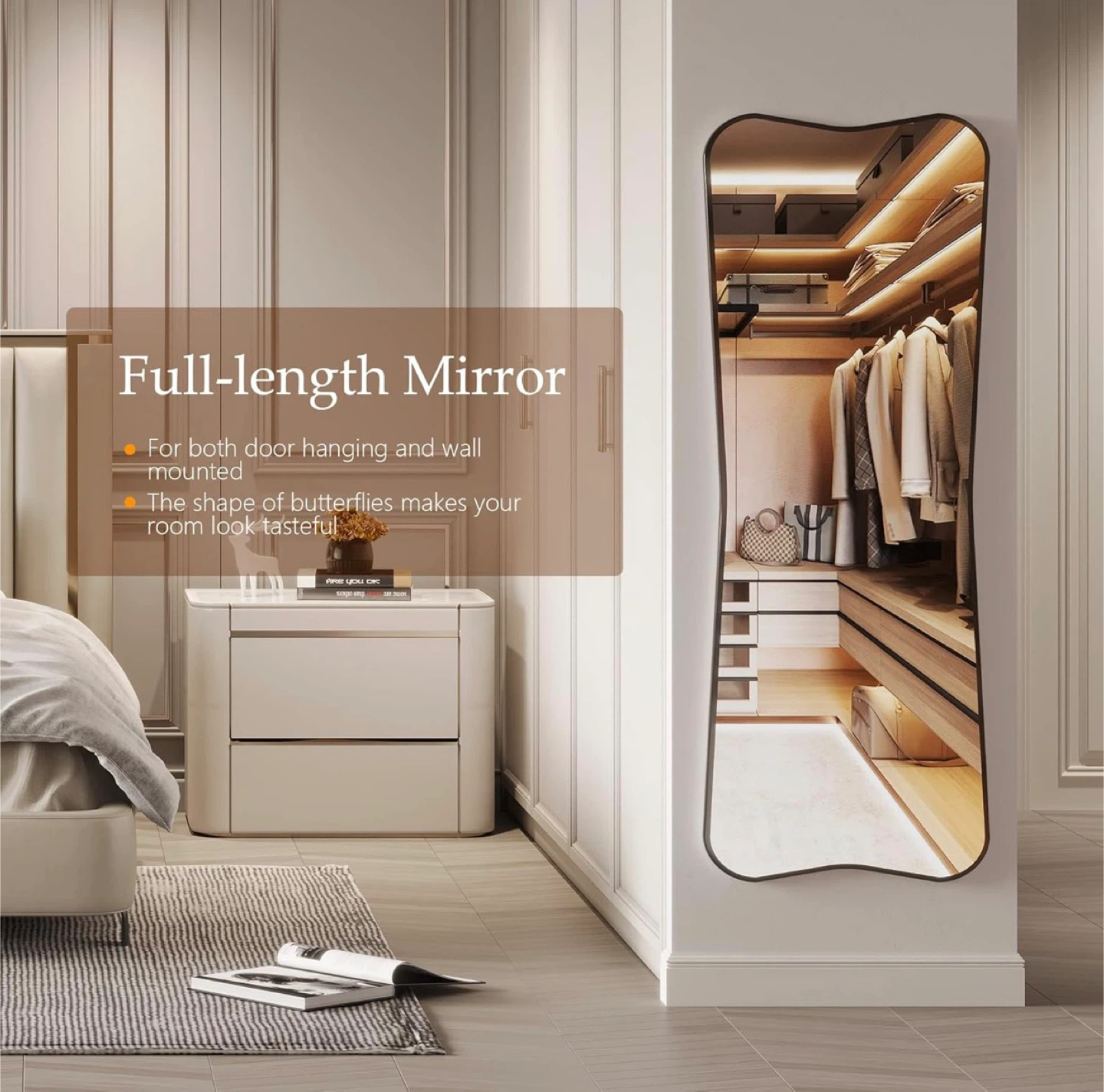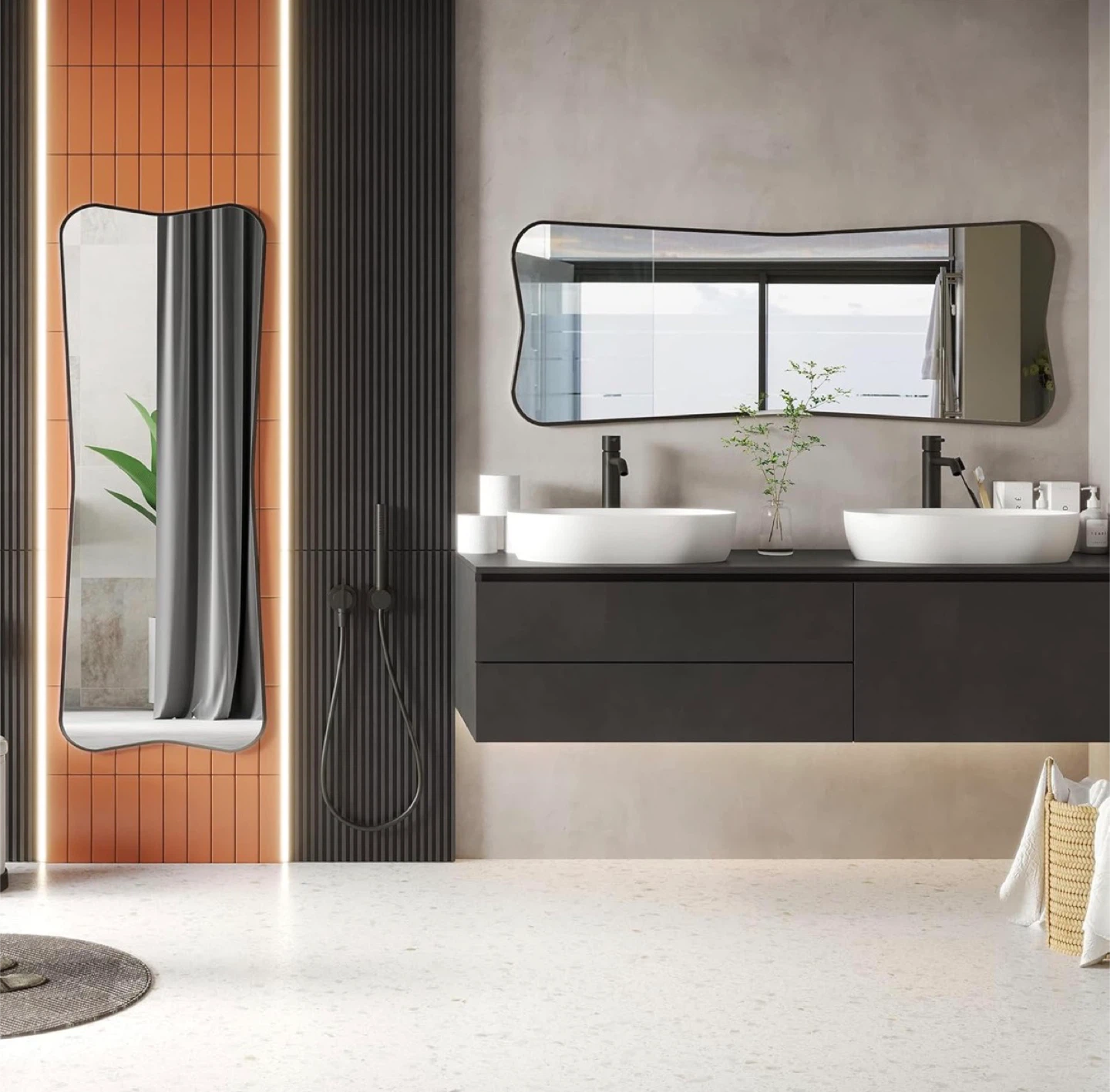 This full-length mirror features a unique, irregular wavy shape and a sleek black frame. It can be door-mounted, wall-mounted, or leaned against a wall. Its distinctive design adds a touch of artistry to any room!