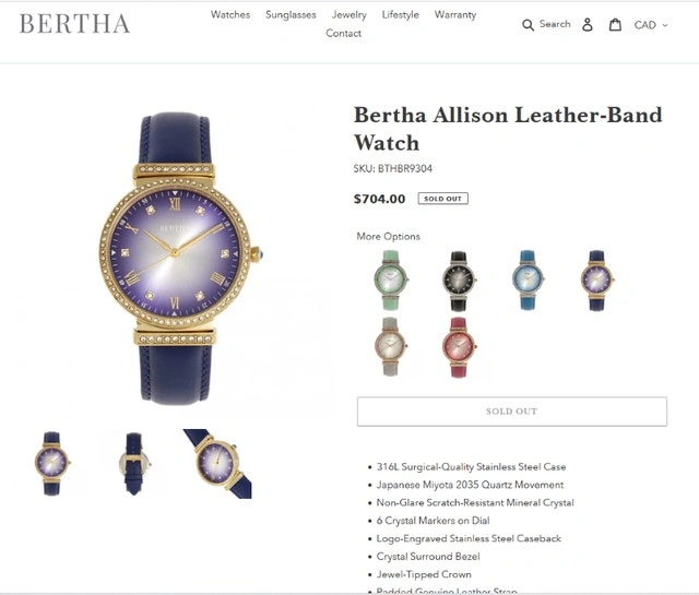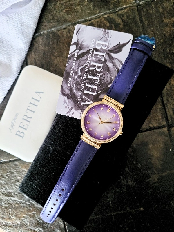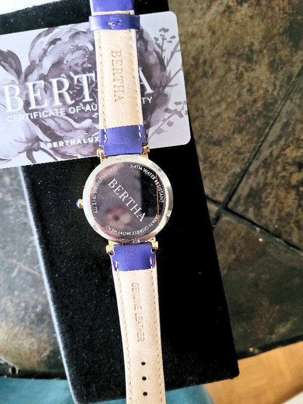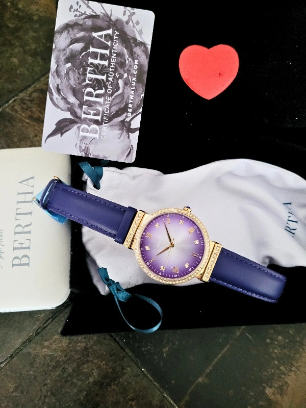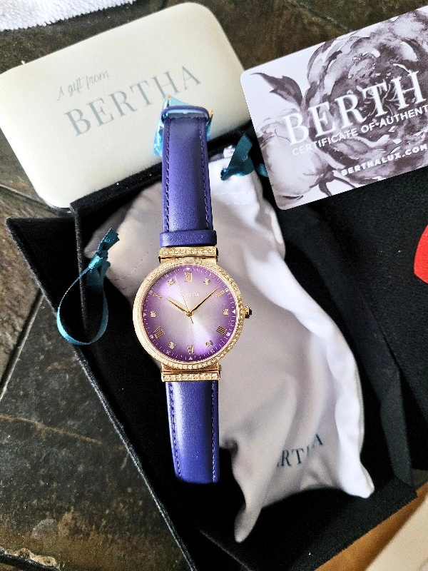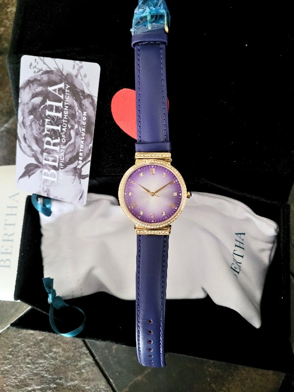 Brand new in the box with Certificate of Authenticity card. Retail value: $700. Model BTHBR9304 Allison. Features a 316L surgical-quality stainless steel case, non-glare scratch-resistant mineral crystal, Swarovski surround bezel, jewel-tipped crown, padded genuine leather strap, and logo-engraved stainless steel clasp. Case diameter is 37mm. Case color is gold. Dial and band color is purple. Movement is quartz with 5 ATM water resistance. Pick up area is Sheppard & Don Mills. Cash and cashless payments are accepted.