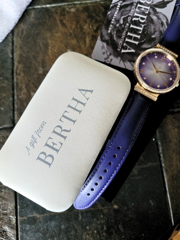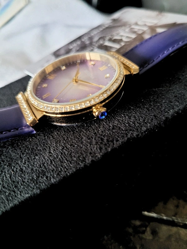 Brand new in the box with Certificate of Authenticity card. Retail value: $700. Model BTHBR9304 Allison. Features a 316L surgical-quality stainless steel case, non-glare scratch-resistant mineral crystal, Swarovski surround bezel, jewel-tipped crown, padded genuine leather strap, and logo-engraved stainless steel clasp. Case diameter is 37mm. Case color is gold. Dial and band color is purple. Movement is quartz with 5 ATM water resistance. Pick up area is Sheppard & Don Mills. Cash and cashless payments are accepted.
