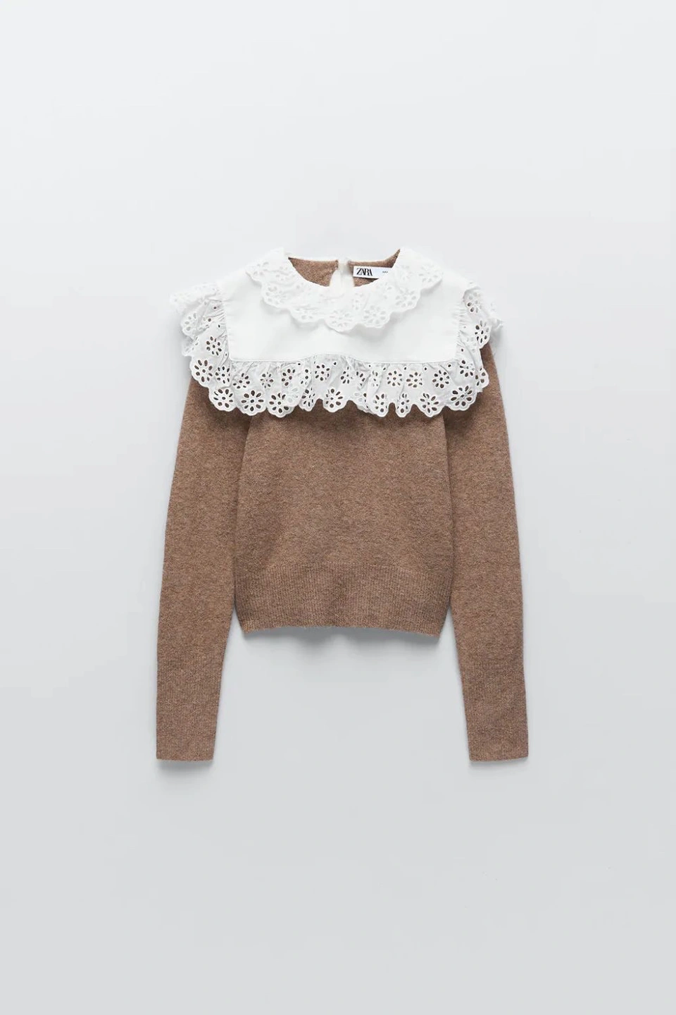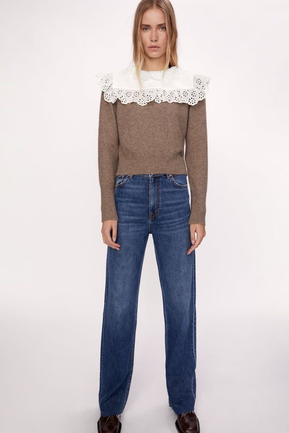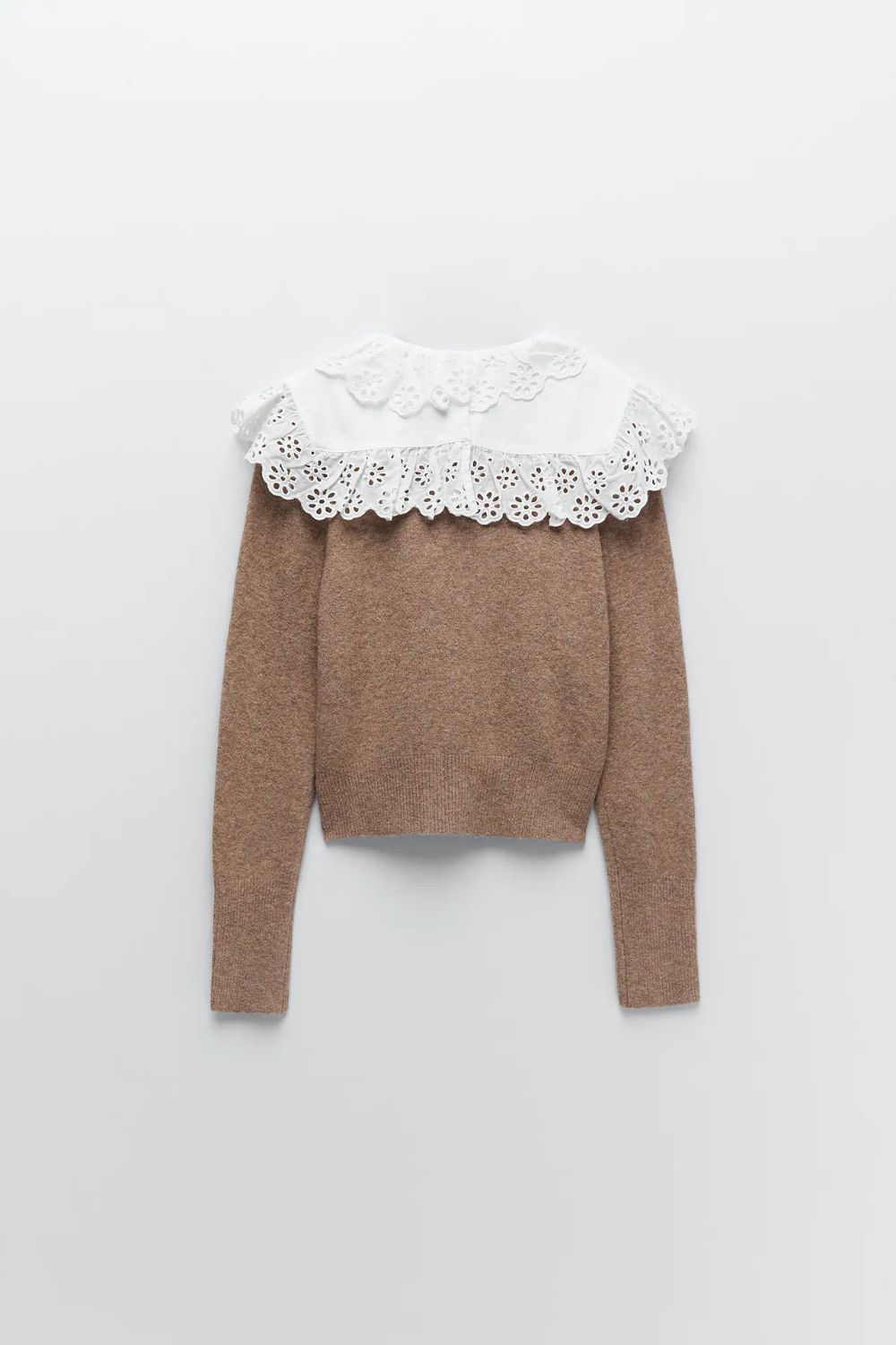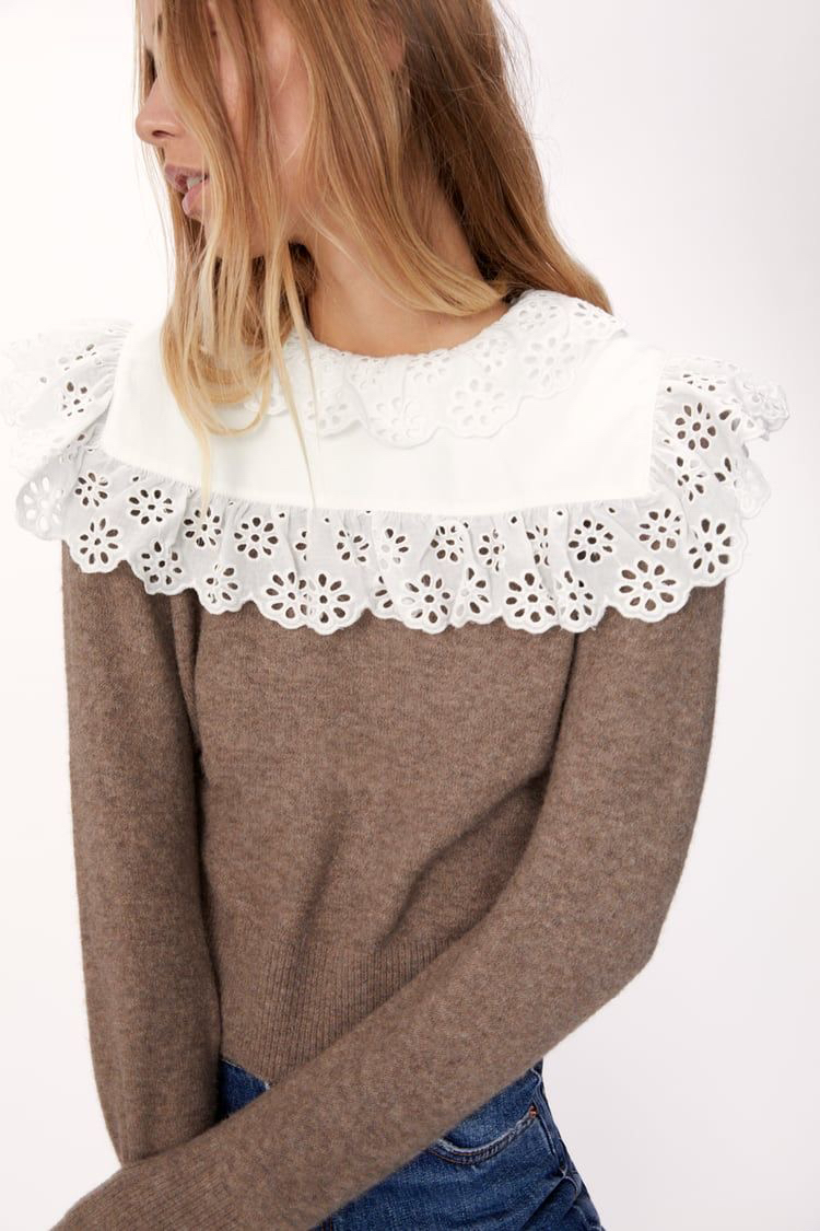 150Zara Combination Wool Sweater. Sweater made of wool blend fabric. Round neck and long sleeves. Poplin appliqué with embroidered eyelet trim. Back opening with button closure. Size small.