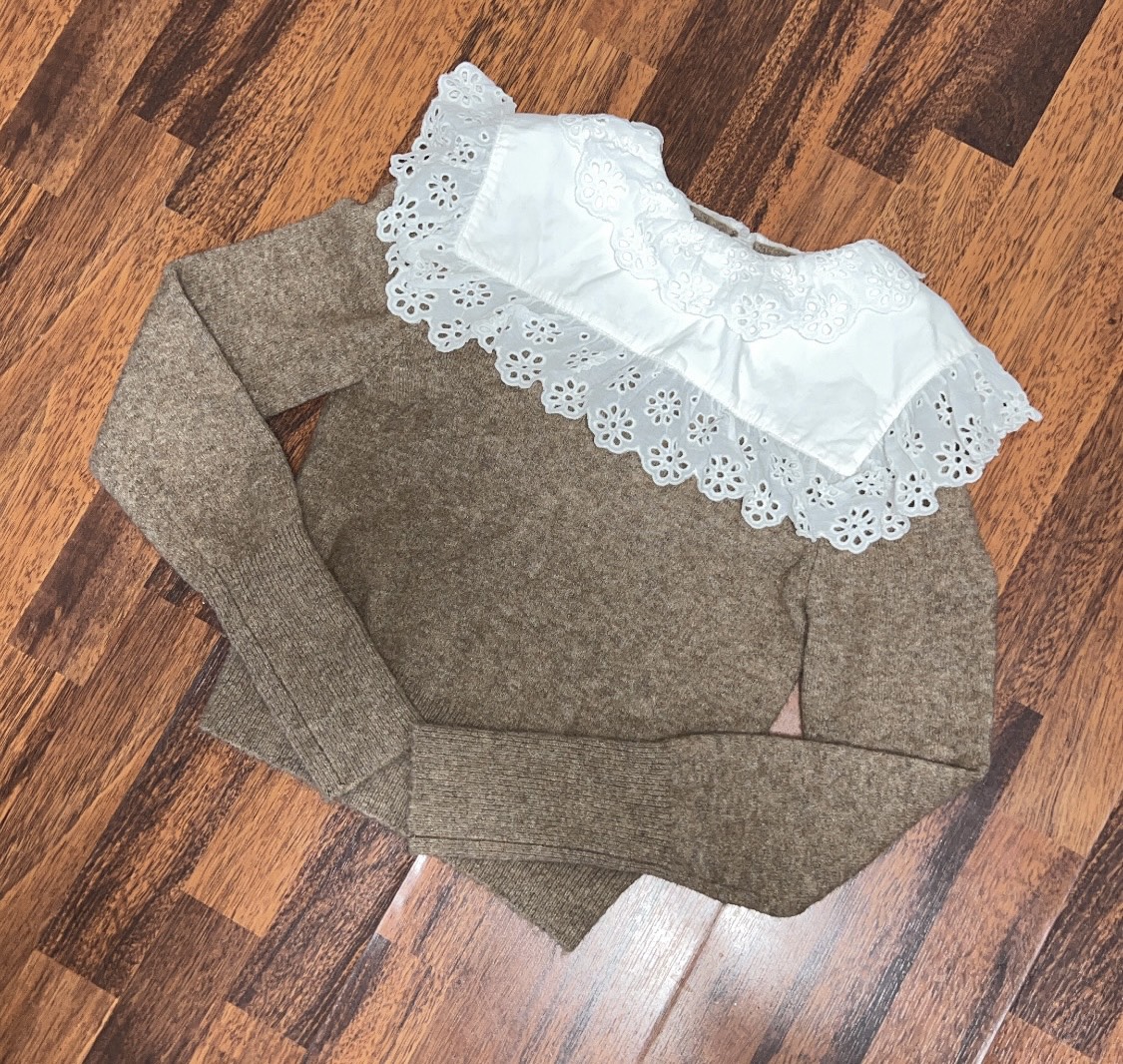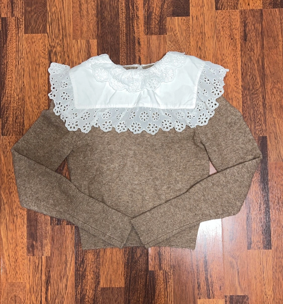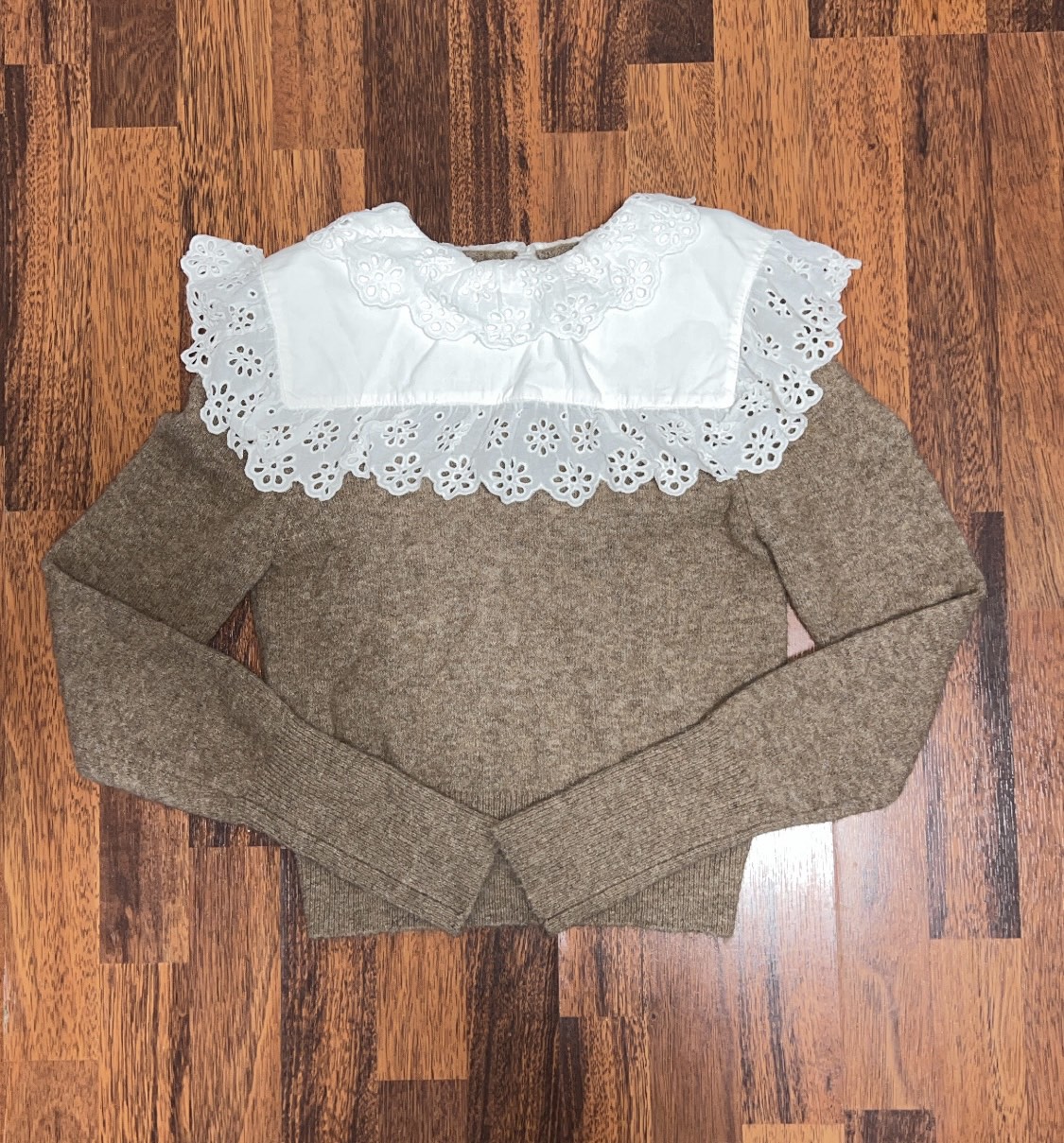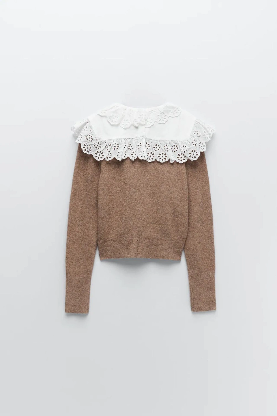 150Zara Combination Wool Sweater. Sweater made of wool blend fabric. Round neck and long sleeves. Poplin appliqué with embroidered eyelet trim. Back opening with button closure. Size small.