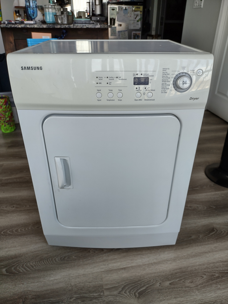 572Used Samsung Dryer. Was part of a stacked washer/dryer set. so condo sized. still works. must be able to pick it up. can help lift but cannot deliver