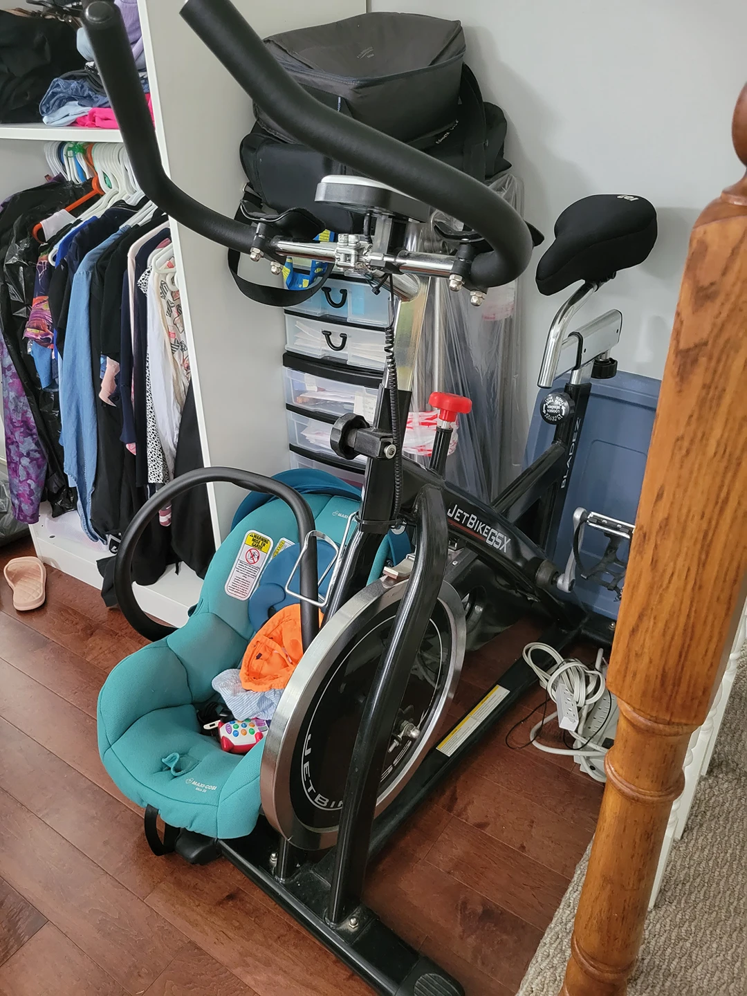 Other features: smooth, quiet belt drive, toe basket on foot pedals, wheels to reposition bike, adjustable racing-style handlebars with elbow pads, up/down and fore/aft 4-way adjustable seat, and a water bottle holder