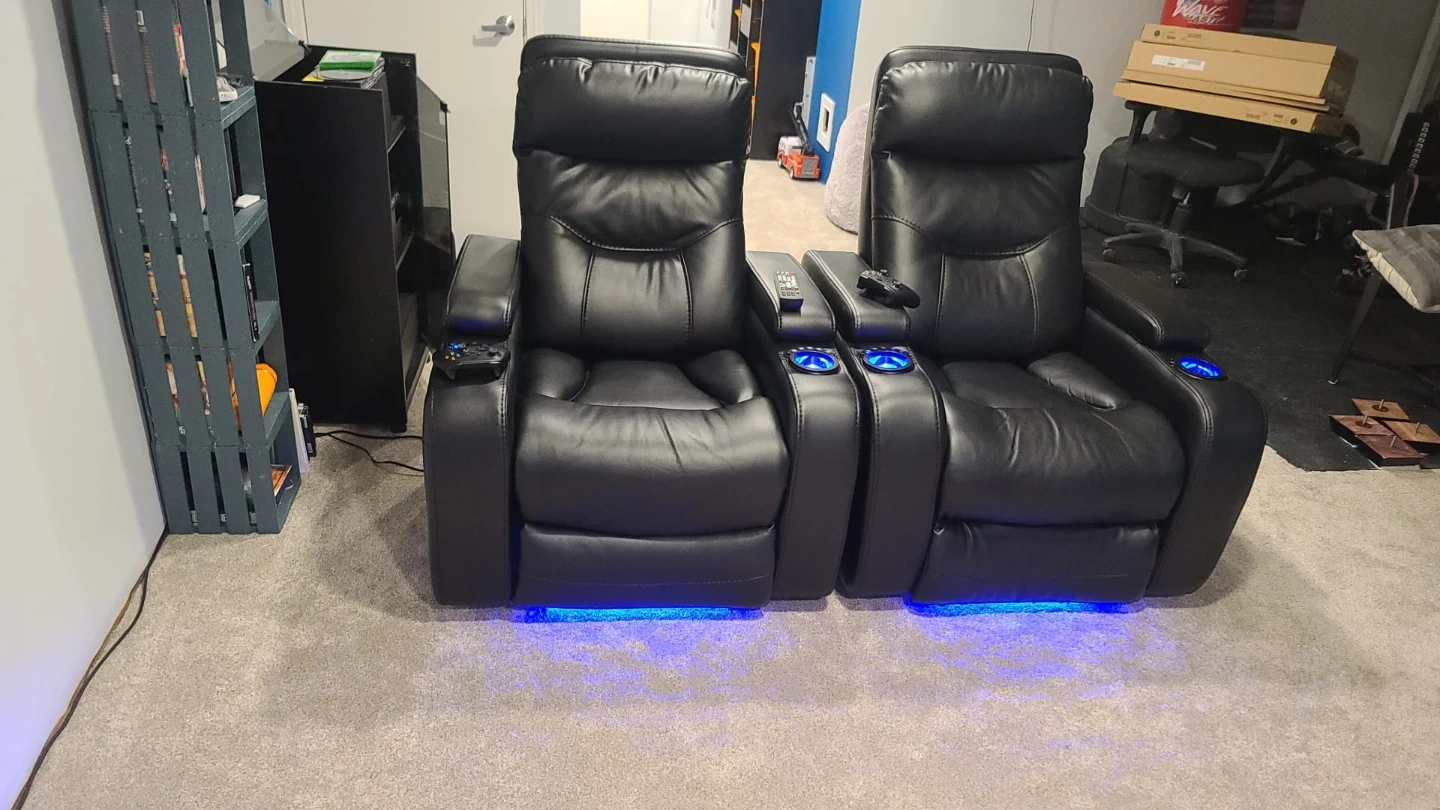 Selling a set of black leather home theatre recliner seats. They feature blue LED lighting and convenient cup holders. Perfect for creating a cozy movie night experience right at home!FOR SALE: Dual VIP Power-Recline Cinema Thrones with Signature LED Suite