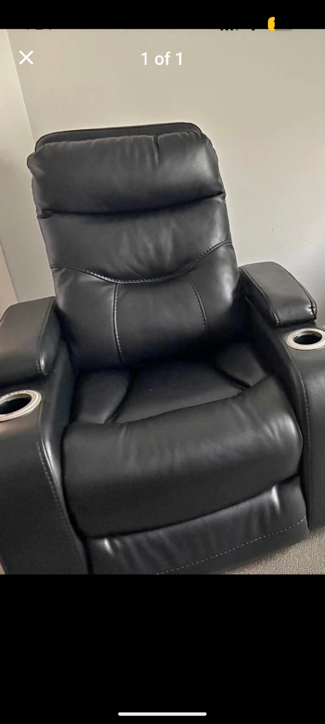 Selling a set of black leather home theatre recliner seats. They feature blue LED lighting and convenient cup holders. Perfect for creating a cozy movie night experience right at home!FOR SALE: Dual VIP Power-Recline Cinema Thrones with Signature LED Suite