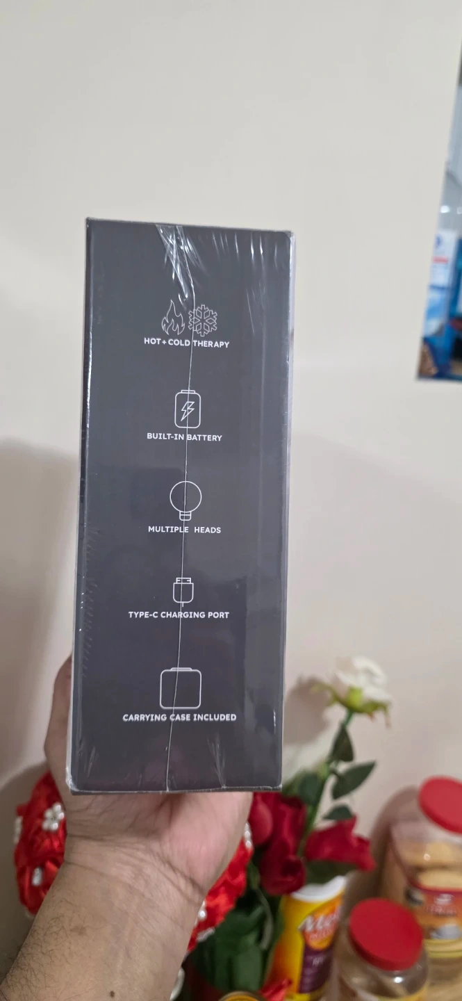 Bran new NOVONERGY massage gun with hot and cold therapy. It's designed for deep muscle cooling and heating. Includes 4 heads, charging cable, and carrying case..