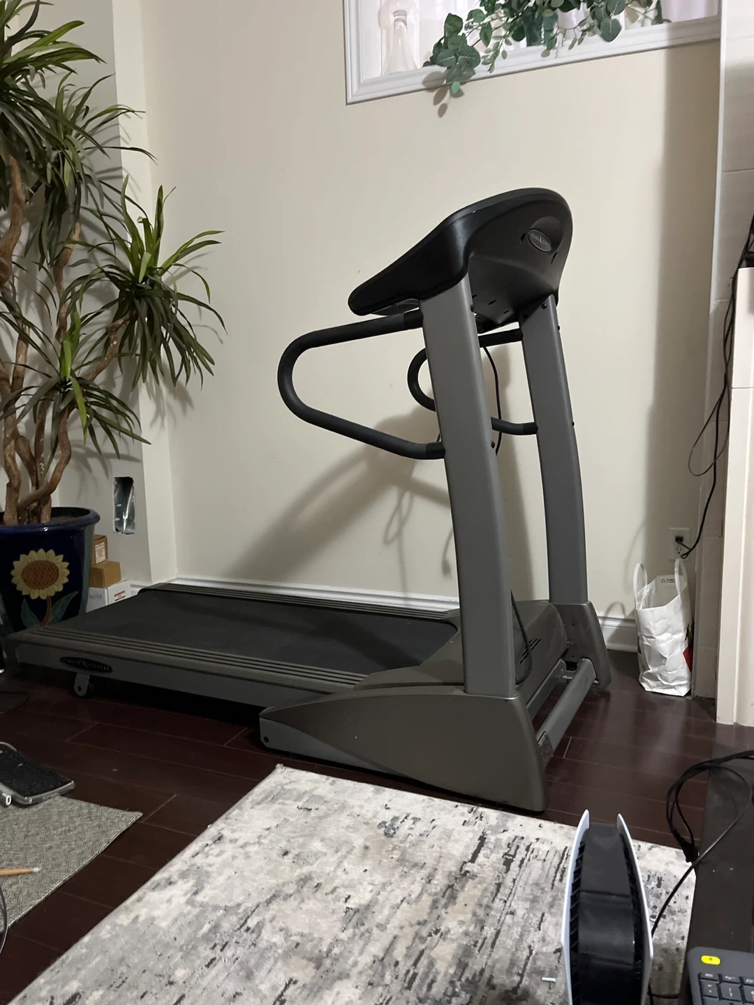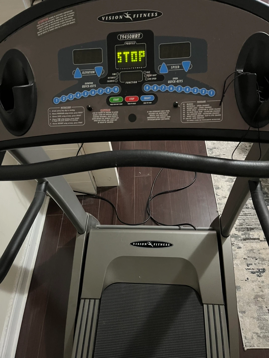 Selling a Vision Fitness treadmill, model T9450HRT. It has different programs like weight loss, speed walk, 5k back trail run, and heart rate control. The display shows time, distance, and calories burned. It also has quick keys for speed and elevation. Paid 2,000 before tax