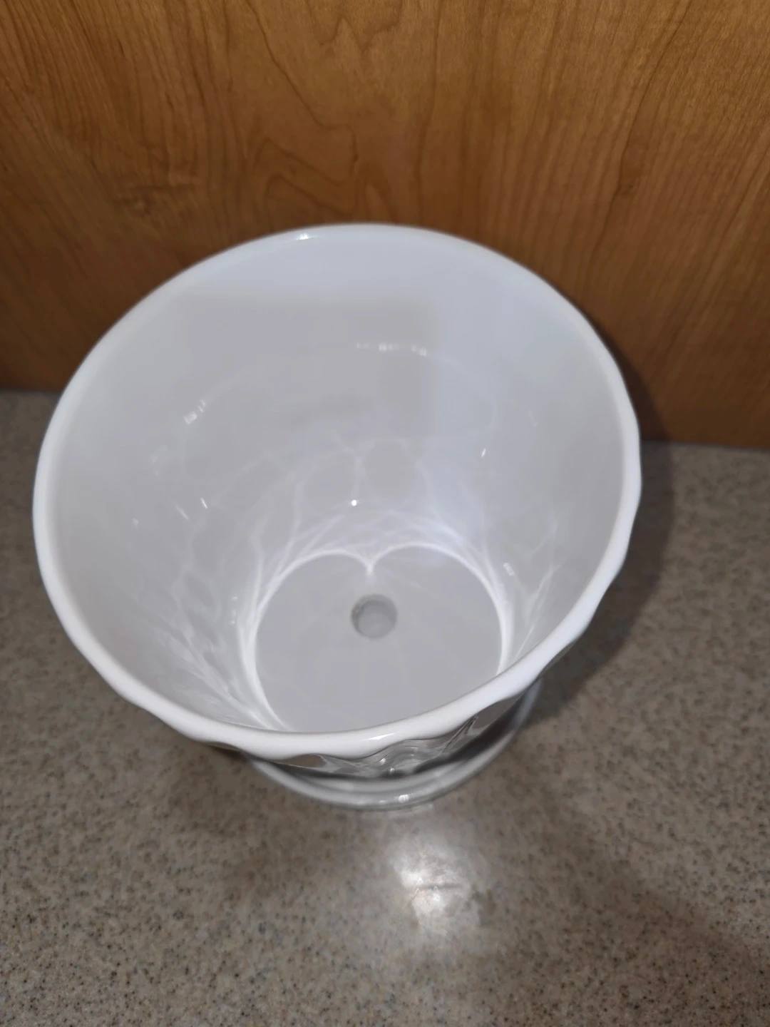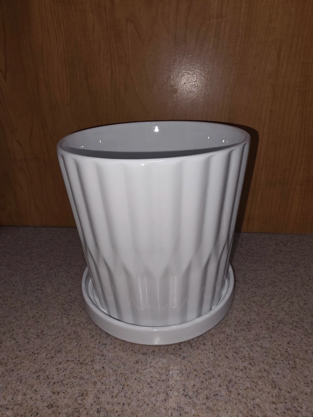A white ceramic plant pot with a matching saucer. It has a nice, clean look with a subtle spiral design. Perfect for adding a touch of greenery to your space.