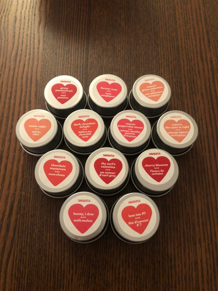 12 empty David’s tea boxes / valentine themed. These boxes are clean and in great condition. Can be very useful to store spices, medication, or beads…etc.