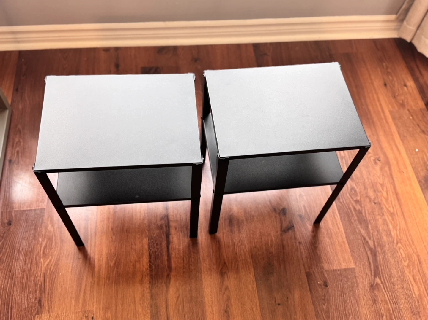 Two black IKEA KNARREVIK side tables are available. These tables are made of metal. They're perfect for placing next to a sofa or bed for easy access to items. Each table has a top surface and a lower shelf.