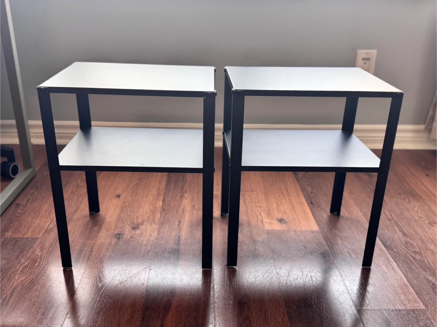Two black IKEA KNARREVIK side tables are available. These tables are made of metal. They're perfect for placing next to a sofa or bed for easy access to items. Each table has a top surface and a lower shelf.
