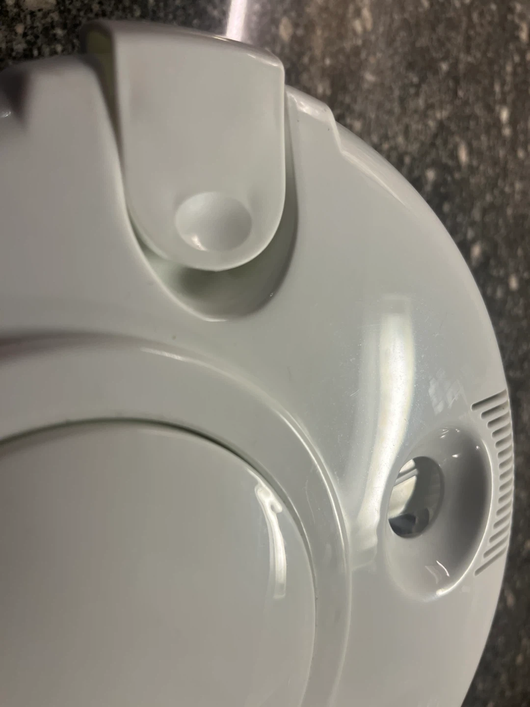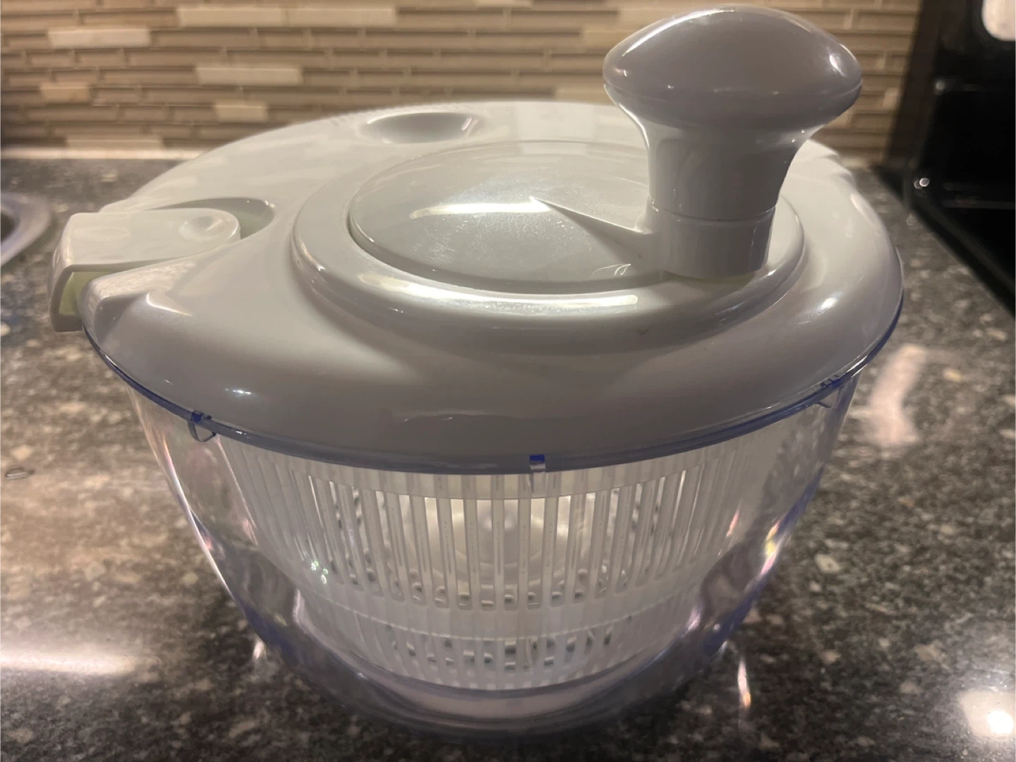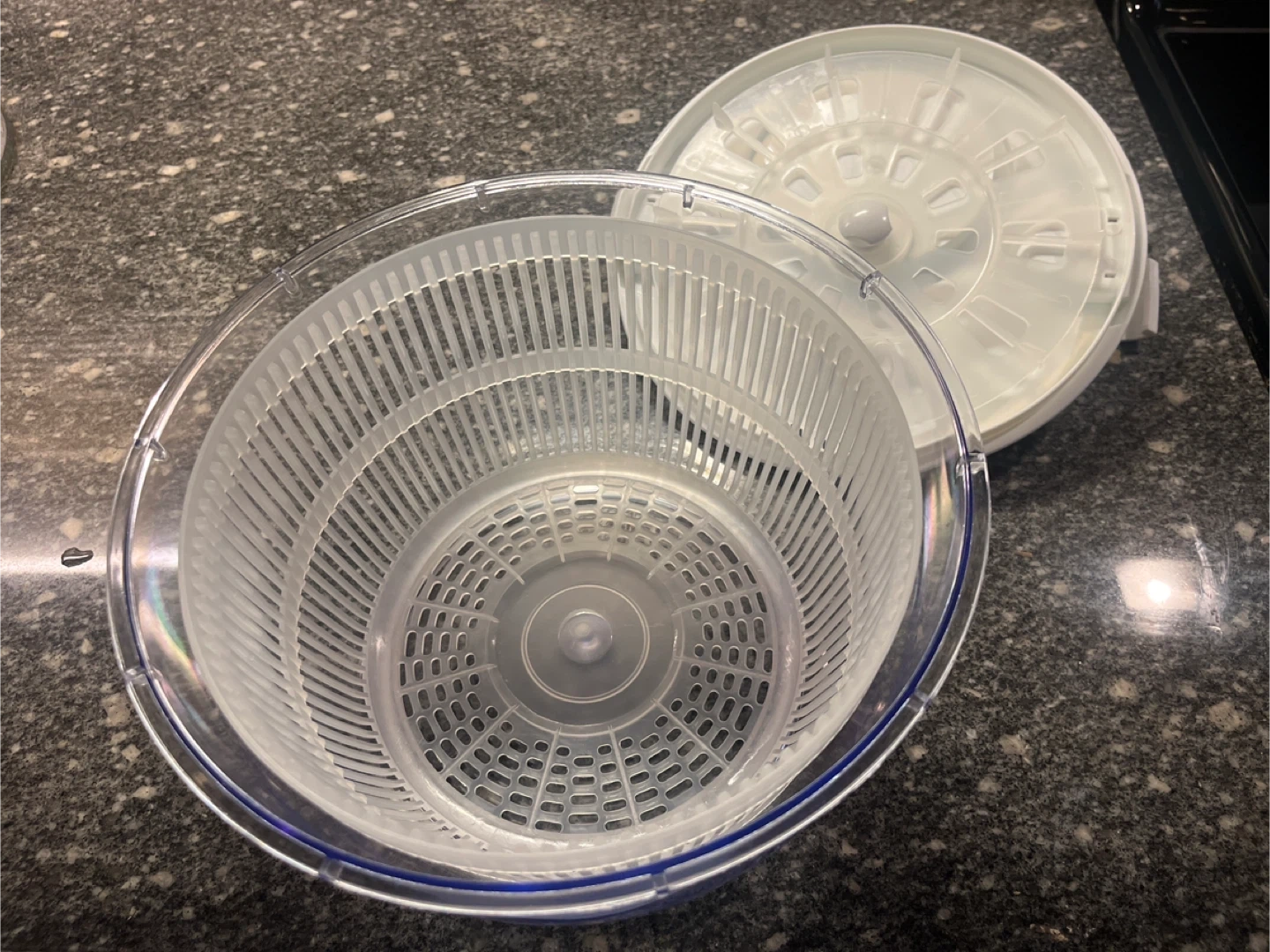 It's comprised of plastic and contains a clear outter bowl, with another mesh bowl situated inside.