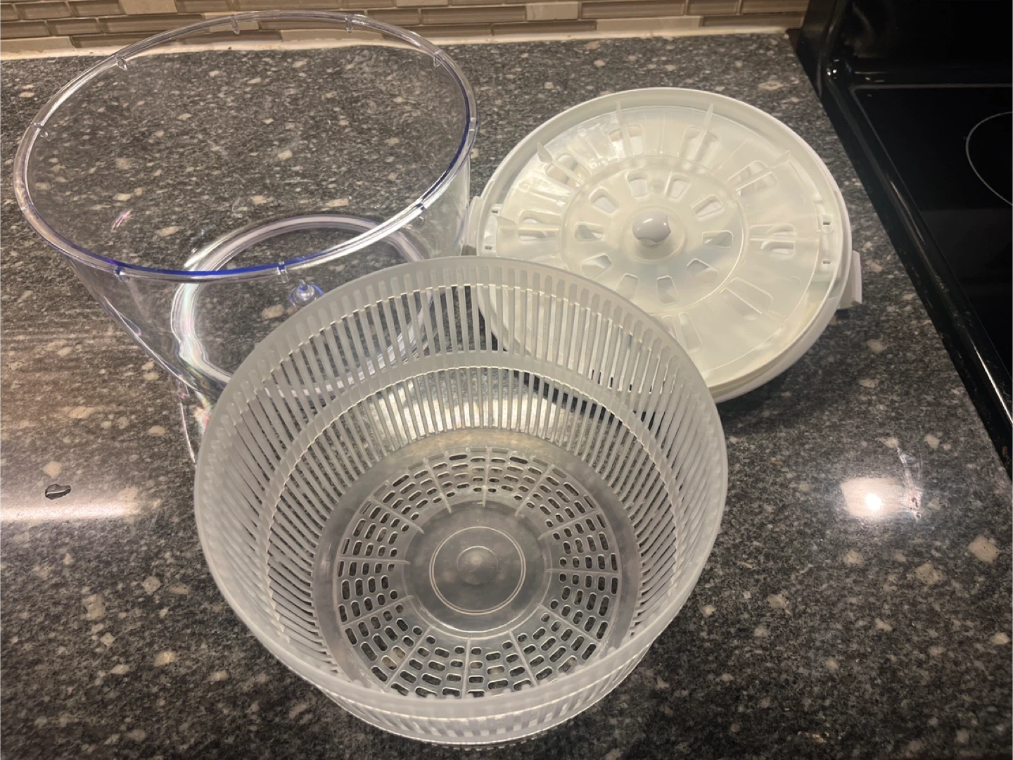 It's comprised of plastic and contains a clear outter bowl, with another mesh bowl situated inside.
