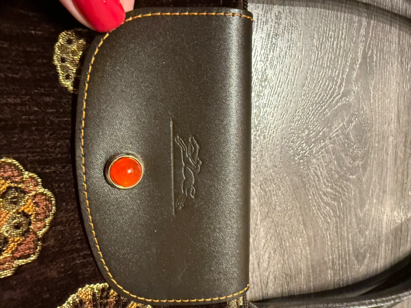 This Longchamp Le Pliage tote bag features a rich brown background with a vibrant floral pattern. It includes leather handles and a leather flap closure with a decorative button. A convenient zip closure keeps your belongings secure.