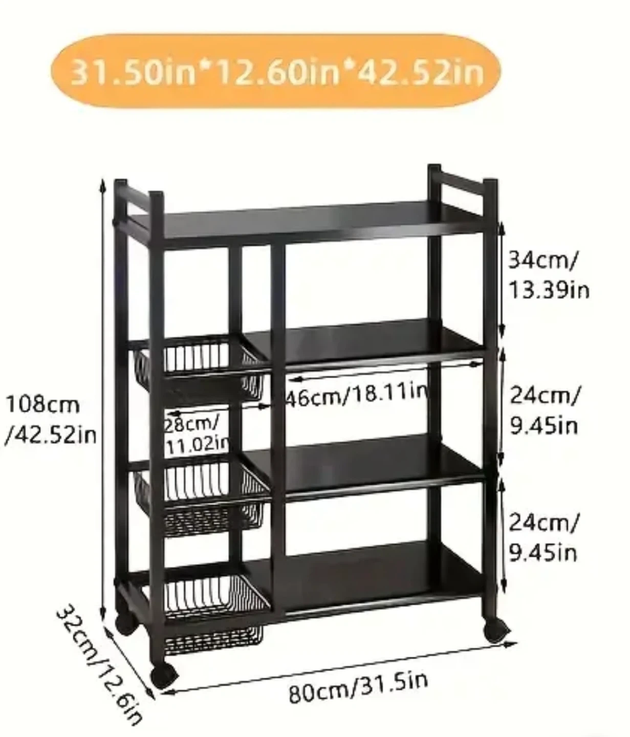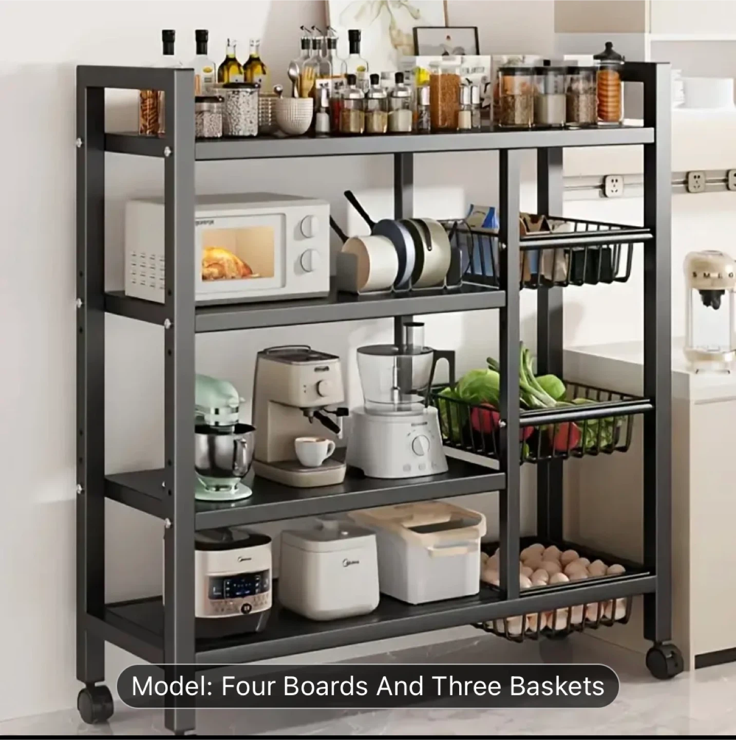 This kitchen storage rack features four shelves and three pull-out baskets for ample storage.