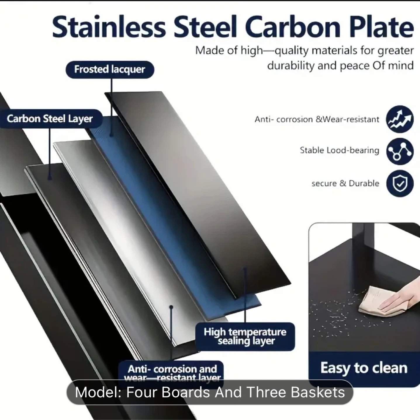 It's made from stainless steel carbon plate with frosted lacquer for durability and is anti-corrosion and wear-resistant.