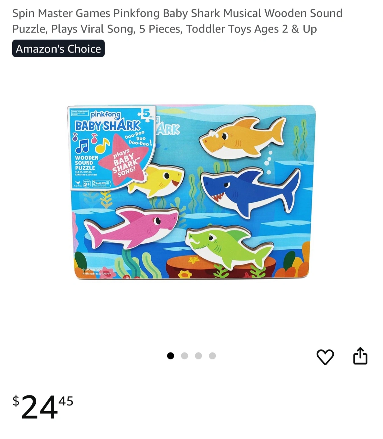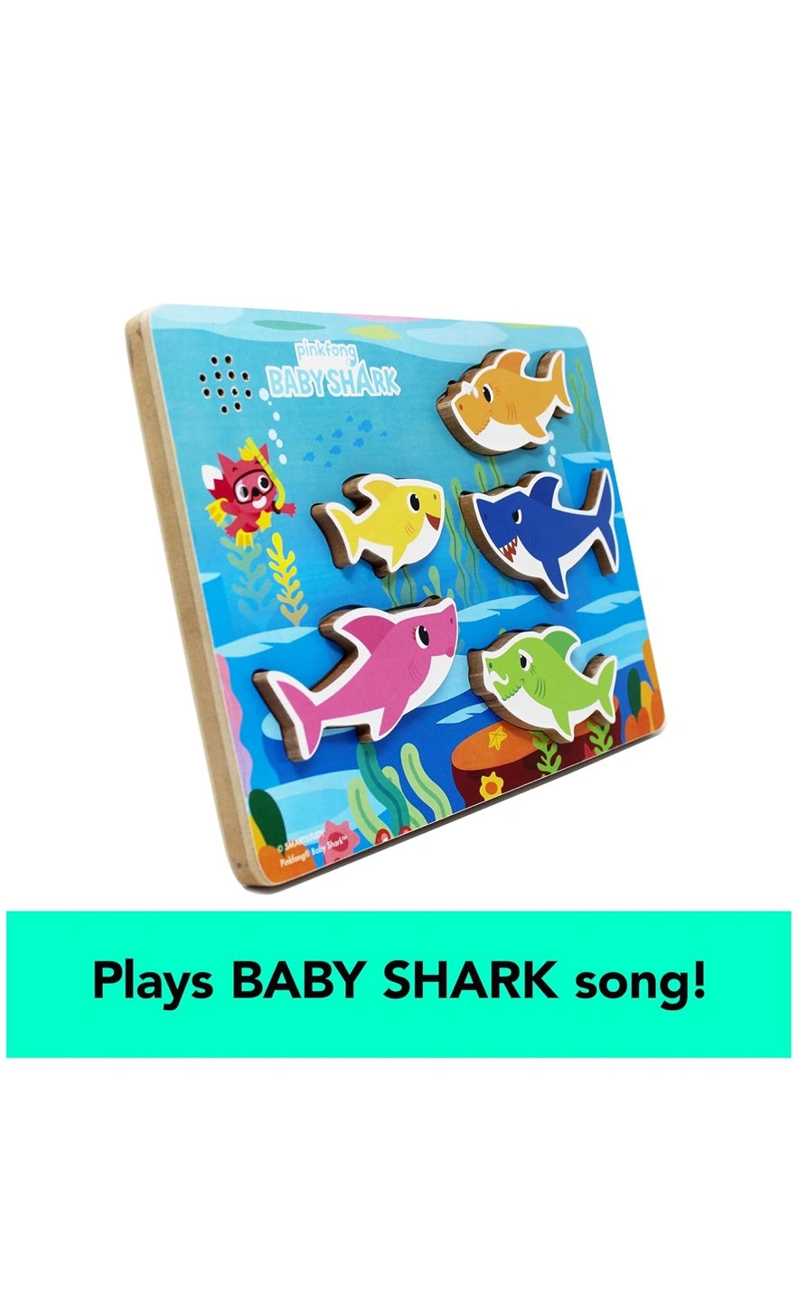 This is a Pinkfong Baby Shark musical wooden sound puzzle. It plays the viral Baby Shark song and has 5 pieces. Recommended for toddler ages 2 and up. Wooden pieces are perfect for little hands!