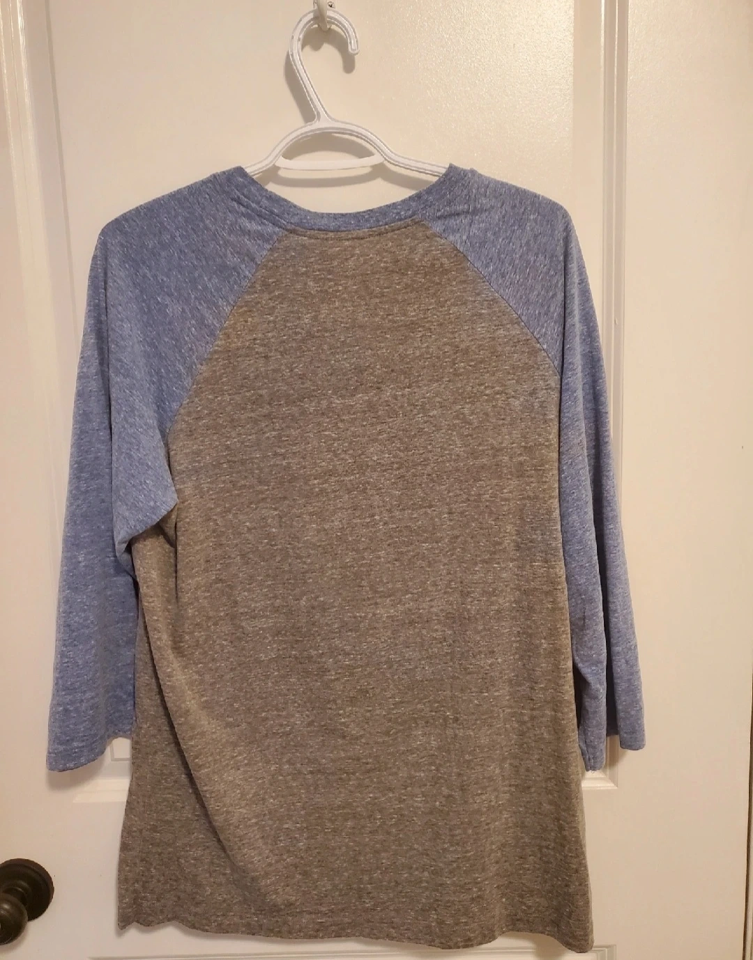 Genuine Merchandise Toronto Blue Jays baseball t-shirt. Raglan style with heather grey body and heather blue sleeves. Made from 50% polyester, 38% cotton, and 12% rayon. Great for any Blue Jays fan!