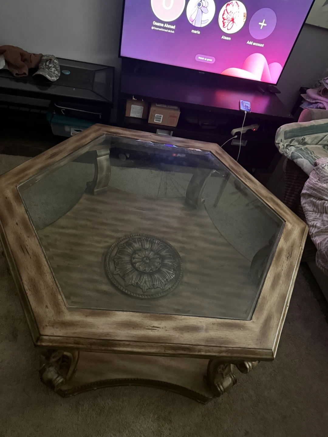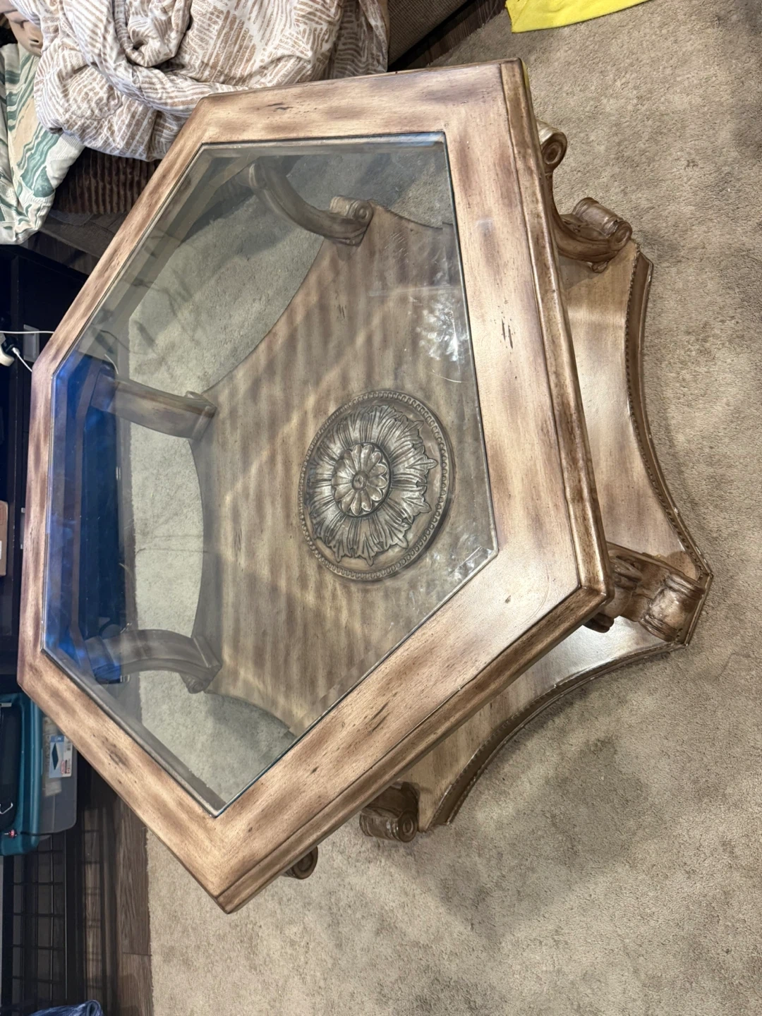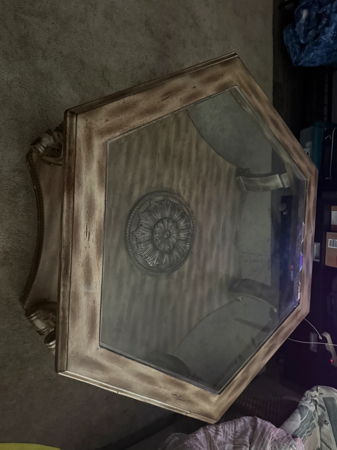 This hexagonal coffee table features a decorative centerpiece and a clear glass top. The wooden frame has an antique-inspired finish with ornate carved details on the legs. It's a stylish addition to any living room!
