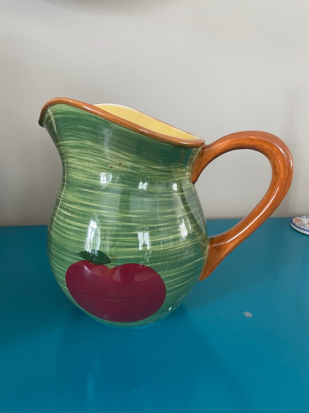 Beautiful , vintage, large 70-ounce pitcher from the discontinued Brookhaven collection by Anchor Hocking. This piece features a charming, rustic aesthetic with a hand-painted red apple motif and soft green brushstroke detailing, perfect for a farmhouse or "Cottagecore" kitchen.